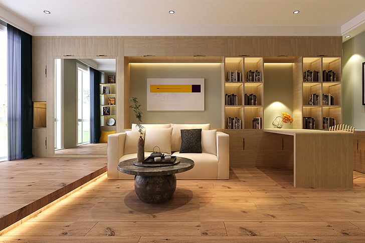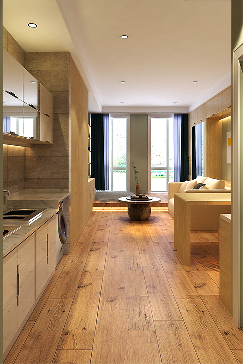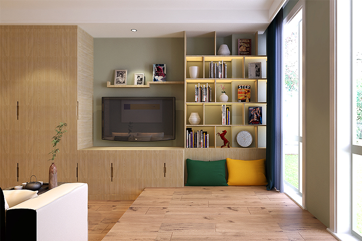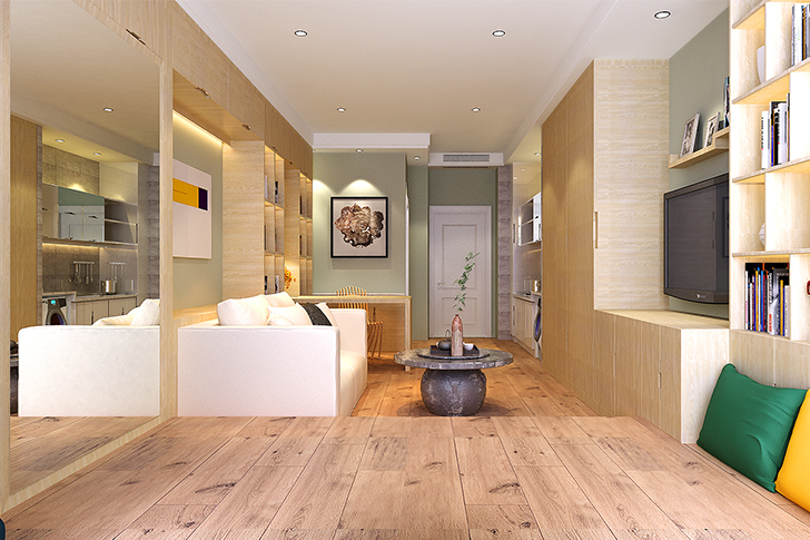 本案例定向为现代风格,业主是一位斯文秀气的女士,平时不怎么做饭,一个小小的开放式厨房一张原木餐桌,既美观实用又节省空间;一个面窗书桌和一位安静人,宽敞明亮的榻榻米休闲区,即使来了朋友,也有足够的空间。不需要花哨的装饰品也不需要华丽的灯光氛围,纯粹的三寸日光,拥有自己简单的美好空间。