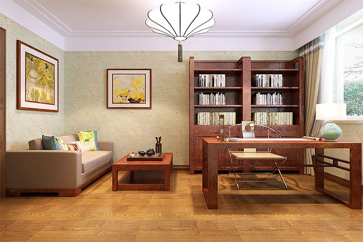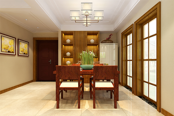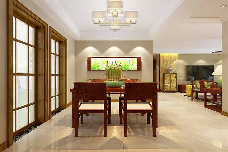 新中式风格的设计大多数采用中国传统元素,中式建筑有自己的特点,实木型家具以及中国特色的门窗装饰,给人一种悠远,宁静的文化韵味.其中主要体现形式为简单肃静的氛围,因为中国传统美学形式强调的是简素美,不采用过多的装饰技巧,体现出淡雅的文化气质,加上现代感的设计更能体现出简素雅的感觉,同时多样的家具也需要体现出统一的和谐型.