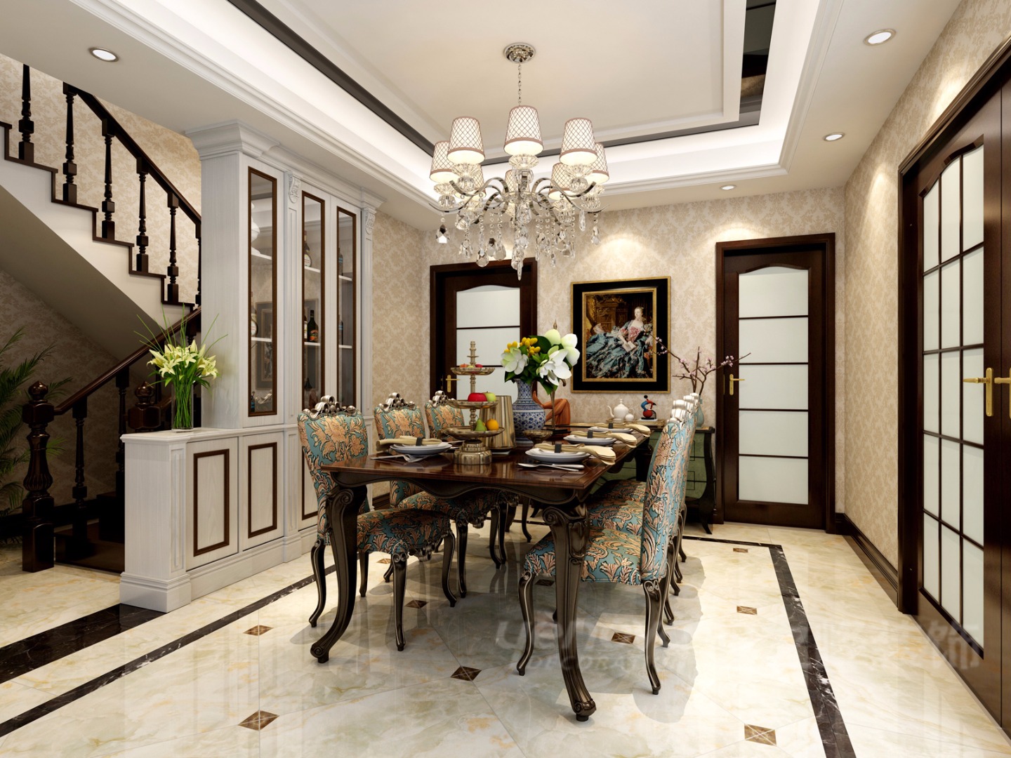 新古典的室内设计展现了丰富的欧洲文化。将怀古的浪漫情怀与现代人对生活的需求相结合,华贵典雅却又不失现代时尚。所体现出来的特点为从简单到繁杂、从整体到局部,精雕细琢,给人一种一丝不苟的印象。即摒弃了过于复杂的肌理和装饰,又简化了线条。例如:客厅的整个天花虽然只是简单的跌级造型但却不失大气,一圈灰镜使天花变得更加有层次。餐厅区域的天花与客厅对应,而地面的拼花使得整个空间变得简单却不显轻浮。新古典的家具,拥有古典家具的材质及颜色但减少了雕花。在现代人的居室空间内,便呈的温馨且不浮夸,让人目不暇接。主卧室采用淡色的软包陪金属边框使得整个空间自然、典雅。大面积的欧式暗纹墙纸,经典而简约。