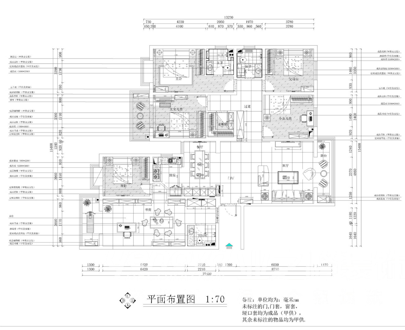 在功能布局上,尽量满足业主生活的需求,同时设计师通过对本案居住空间内的服务人群定位分析,设计出了满足各个年龄阶层、性别人群的功能布局。客厅是交流娱乐中心,主次分明,相对独立,将书房与客厅设置在同一空间范围内,以虚拟流动式的形态特征来体现客厅的功能性。卧室的布局设计在人性心理上也更加体现了其私密性与安全性。