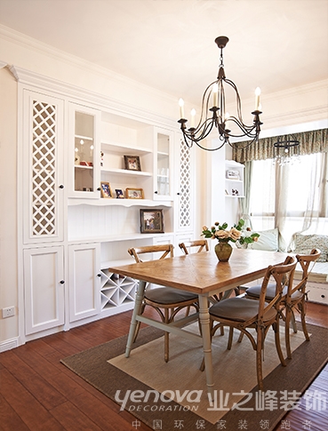 厨房:风格相对简洁,以实木材料制作的餐桌及椅凳朴实而自然,细节处理十分考究,如流畅的桌边线条,桌面及椅子的纹理,都凸显着家居生活的品质感。餐桌旁别具一格的陈列柜,实用美观。