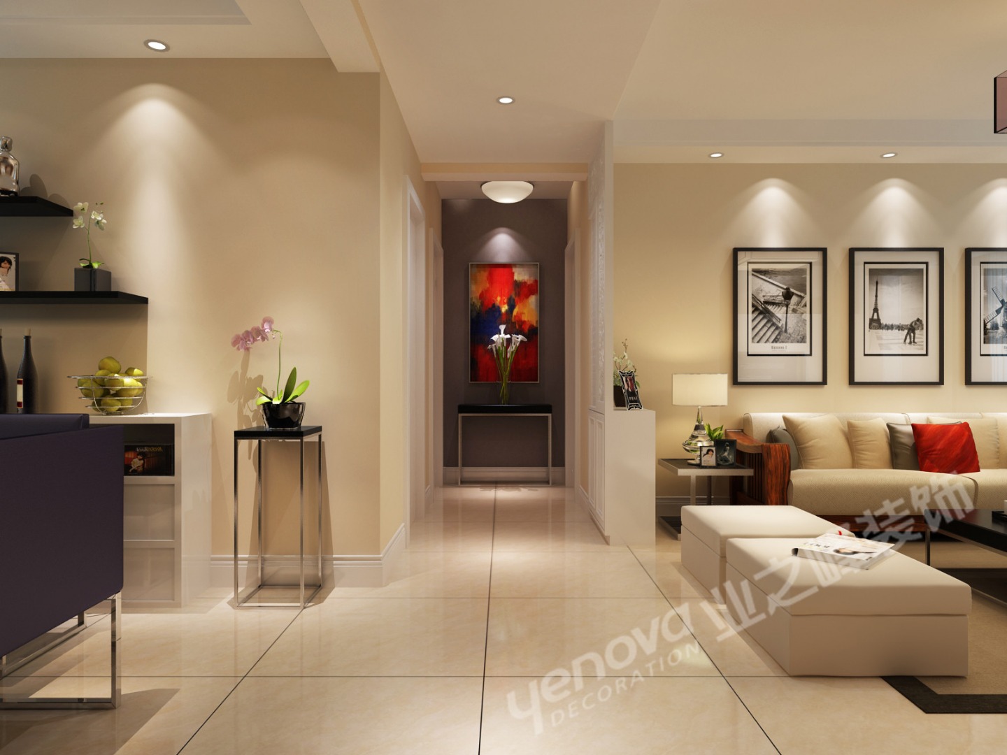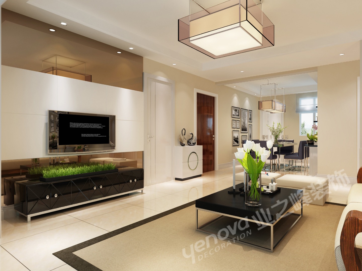 案以黒、灰、米黄、白四色作基调,以讲究生活品味、追求视觉效果的知识型年轻家庭为主题。倡导现代、简洁又不失温馨、和谐,做到物有所值,稳重又不失大气。在这个空间内用细节、材料和搭配,来营造特有的气氛。整体设计以现代简约为主,但简约而不简单。