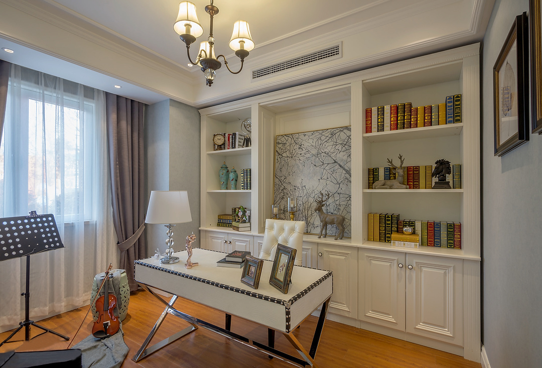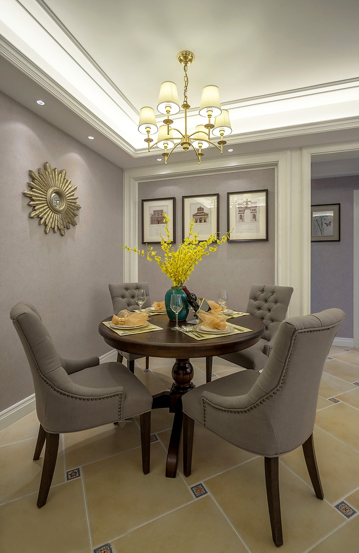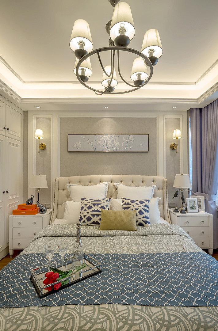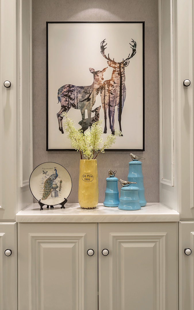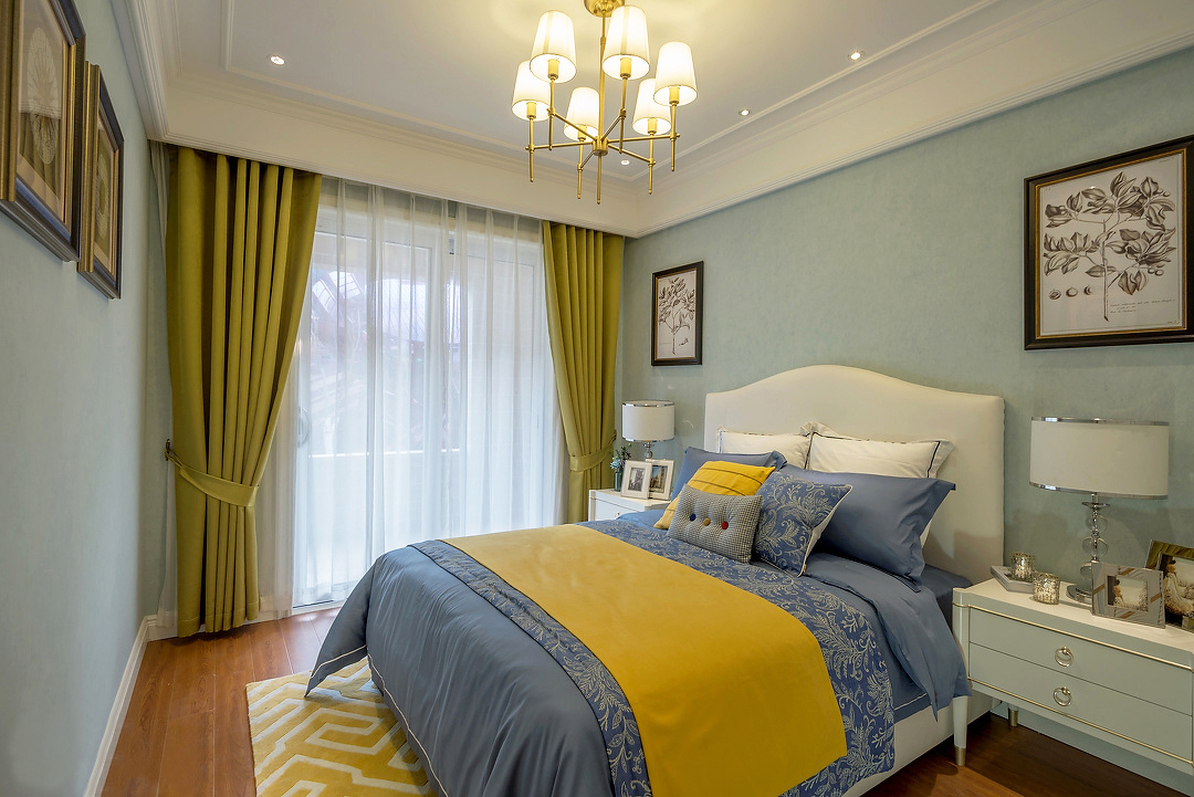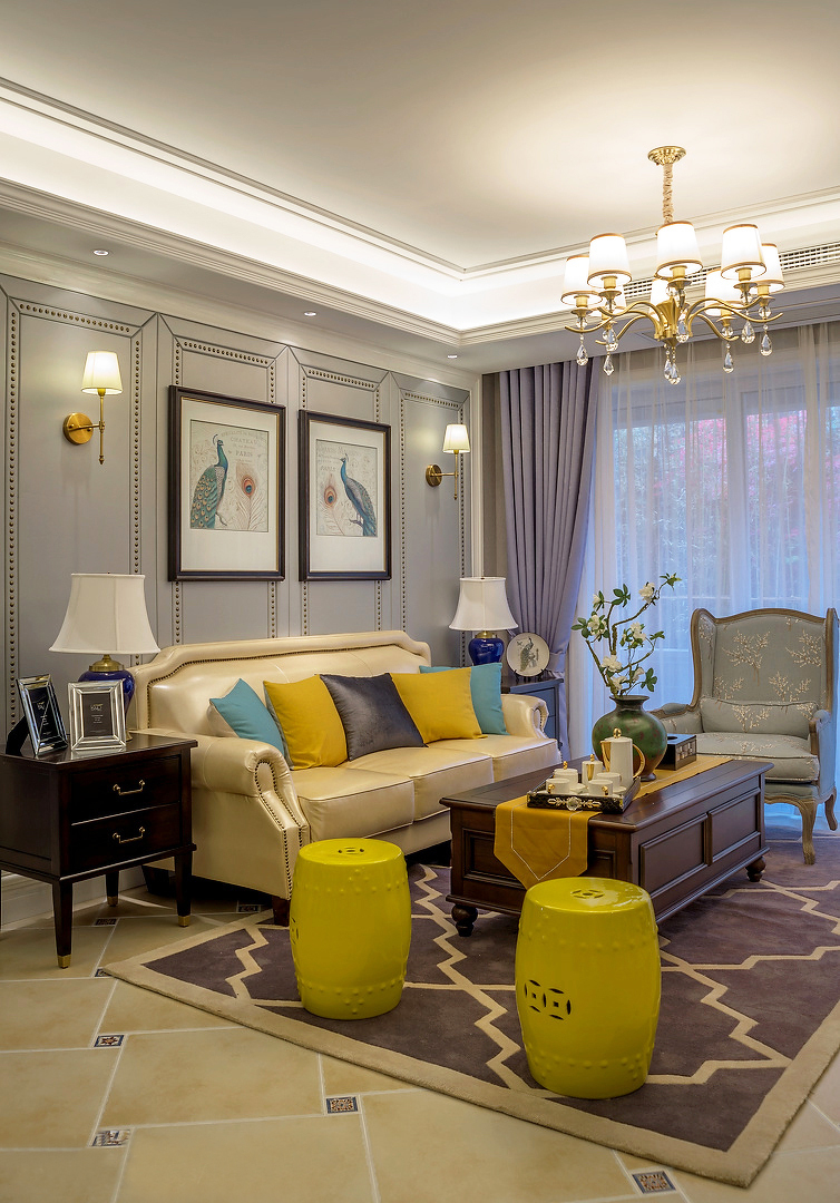 本案以优雅的美式风格定位,主色调采用蓝灰色系,空间点缀柠檬黄、芥末绿、孔雀蓝,众多颜色和谐相处,整个空间弥漫着典雅与温馨的格调。在整个设计当中,设计师巧妙的融入了一抹雅致的中式情怀,古色古香的圆鼓凳、鸟类的瓷瓶,增添了一些小的意趣。设计师希望通过设计这样一间充满暖阳与静思的房子,为业主营造一种怡然从容的生活方式。在这里,清晨第一缕阳光将沉睡的人们唤醒,睁开惺忪的睡眼,在阳光里轻轻柔柔,迎接一天的开始。