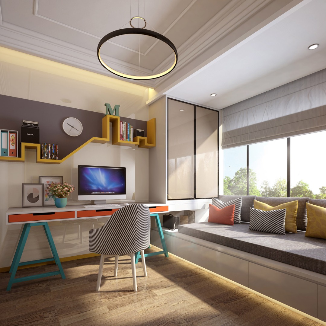 在功能方面,客厅是主任品味的象征,体现了主人品格,地位,也是交友娱乐的场合,电视背景墙采用石膏板做的四个几何造型,既简单又大方,配上顶部照下来的灯光,整个电视背景墙把客厅提升起来。沙发背景墙只做了简单的处理,用细木工板贴上黑色的亚克力板,做了一个悬挂的台面,上面可以放装饰画等,一些装饰品非常实用。