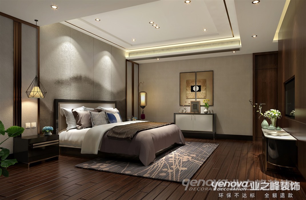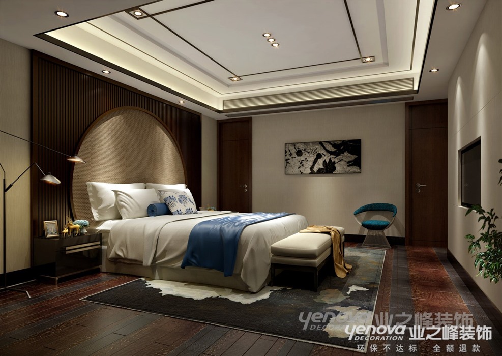 中式元素与现代材质的巧妙兼柔,明式家具、写意墙绘、布艺床品相互辉映,撇去了传统中式的厚重与沉闷,简朴而不简单,自然而不浮躁,新中式风格的移步变景在这里展现的淋漓尽致。
