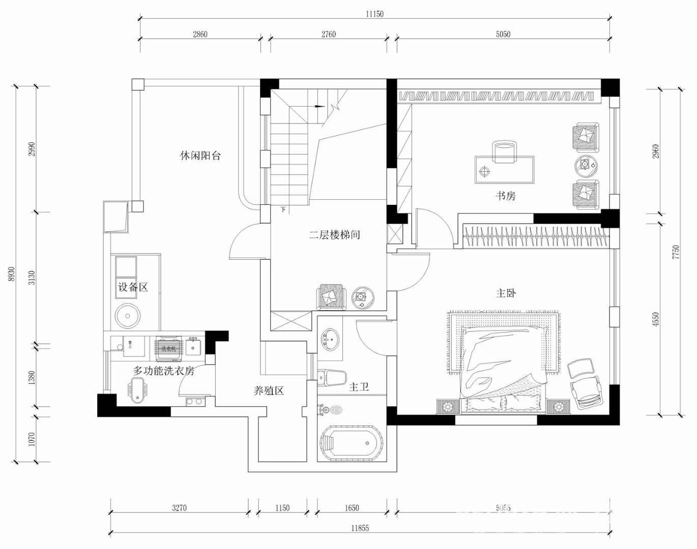 在经过具体分析后,结合现场的水电位以及结构,设计师作出了大胆的调整。首先把入户的卫生间取消,把空间让给了餐厅,这样就有个能和客厅完美匹配的大餐厅。厨房和以前的生活阳台合并,让厨房也很大,可以安放当地人都喜欢使用的冰柜。而餐厅改造后会有个凹处,设计师巧妙的做了把吧台位。多功能房暂时考虑了麻将区域,但是为了以后能扩展成卧室使用,所以电位也按照卧室的摆放而设计。扩展的阳台设计了一个次卧、公用卫生间、景观阳台,使得整体使用功能进一步扩展。而客卧由于很小,而楼梯原来的方式很不合理,所以设计师把楼梯进行了调整,使楼梯下方在一个隐蔽位置,且利用楼梯下面的空间给客卧预留出了衣柜的空间。对于二楼,设计师把书房和主卧套成一体使用,把原来进入书房的门封闭了。把书房门外原有的平台也取消掉,使书房的使用更合理更充分。二楼楼梯间也把原有空间和原有衣帽间和卫生间进行了重新分配,使原来的楼梯间空间变大,不那么压抑,也使主卫空间变大,更能合理使用。对于阳台则把洗衣间和公用卫生间考虑到了一起,提高了使用率,也把这个相对封闭的空间放在了一边。而在卫生间外也考虑了当地人会使用的养殖区域,第一方便养殖,也不会因为这些家禽的味道传到其他空间。