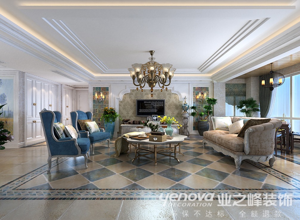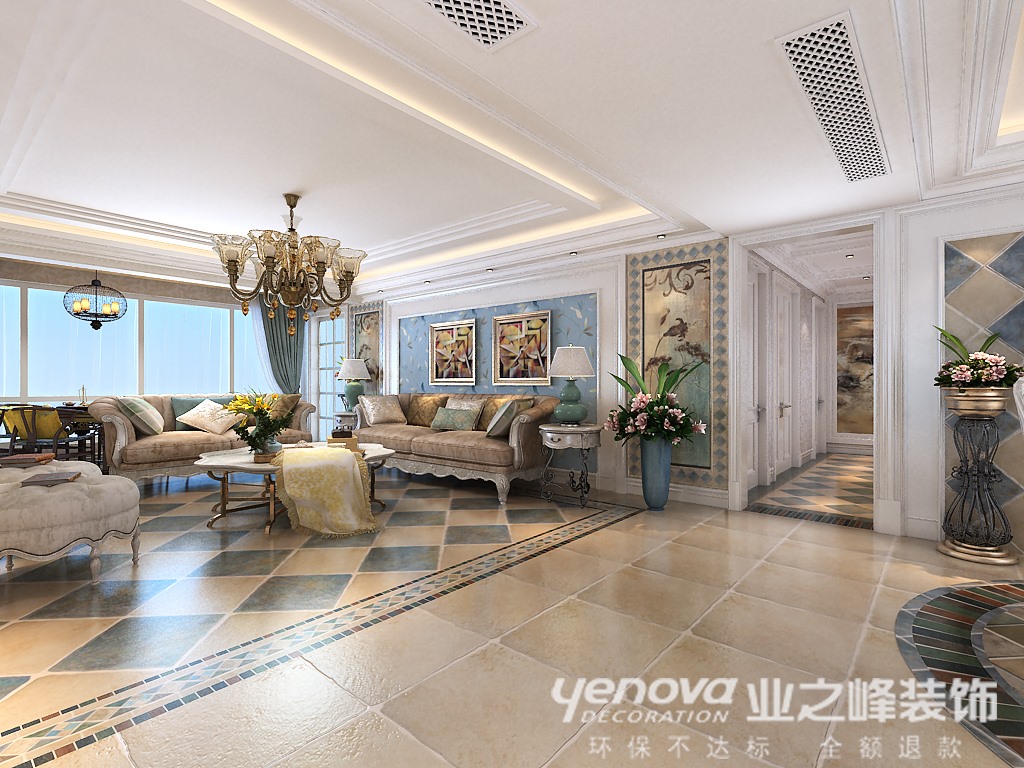 1. 客厅吊顶采用石膏板直线叠级造型及石膏板平板造型形式,增加层次感的同时也不杂乱。地面拼花采用仿古装形式与整个空间的冷色调向呼应。
