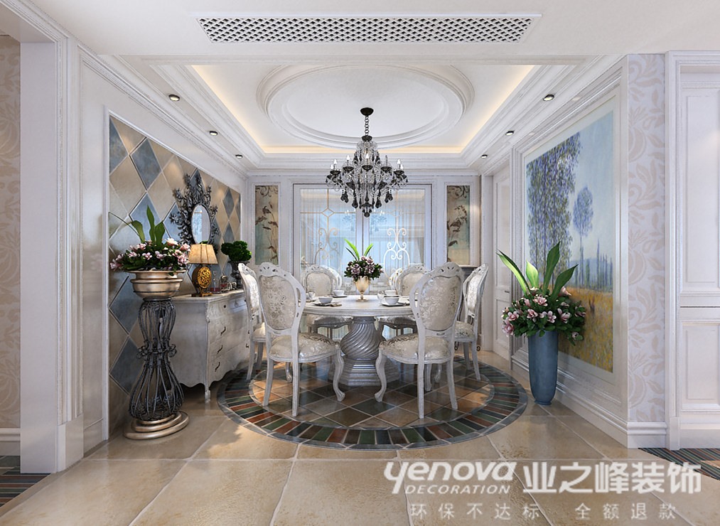 3. 餐厅顶面区域采用直线条吊顶加圆形石膏线造型简洁、大气,餐厅背景墙则采用复古装形式,增