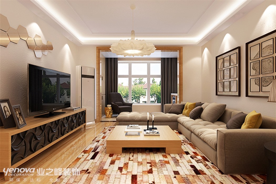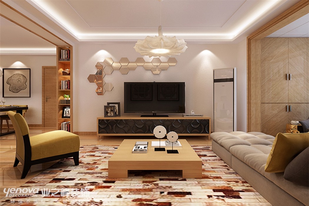 本案设计为新中式风格。在考虑设计的时候,强调一种舒适与实用,设计简约而不简单。在空间中运用了大量的木色,挂上装饰画,墙面运用的硅藻泥,加上质地柔软的沙发和木地板使整体空间简洁、自然、大方。给人带来一种健康的生活状态。吊顶为方形,暗藏的灯带颜色明亮,提升了整体空间。整体的落地窗带来了良好的采光。主要针对三口之家的居住环境,为他们展现了温馨舒适的生活环境。
