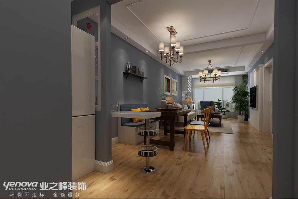 整体效果以女业主喜欢的北欧为主,设计师经过改造将两居室的户型改造的通透明快,又不失设计感。阳台的墙体经过拆除后用镂空的隔断处理,为阳台增添了些许的情调。客卫的墙体采用玻璃隔断,并且在门厅处增加了储物鞋柜,使得空间敞亮,利用率极高。餐厅的小格调分外惬意,虽然冰箱占据了一丝空间,但是通过卡座的设计,餐厅的空间利用丝毫不减。北欧风格表现的淋漓尽致。