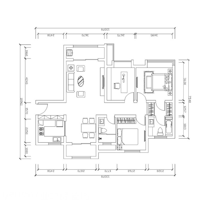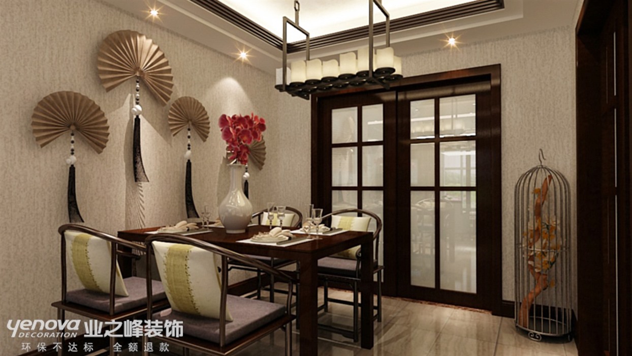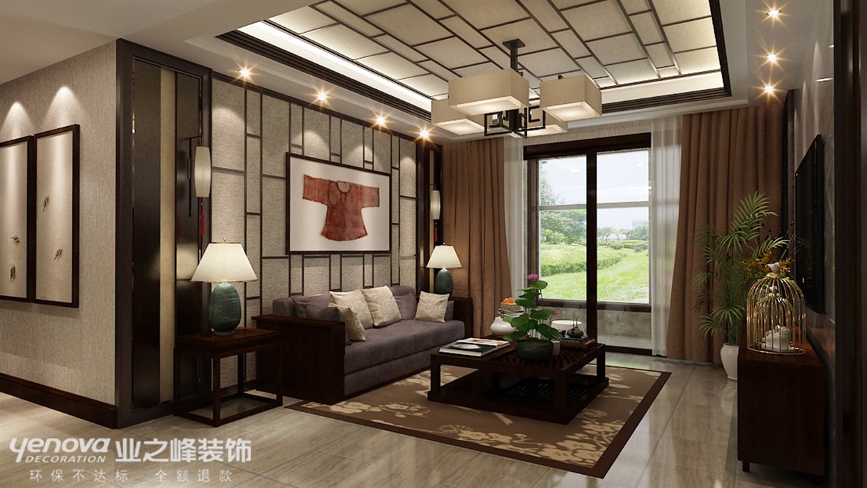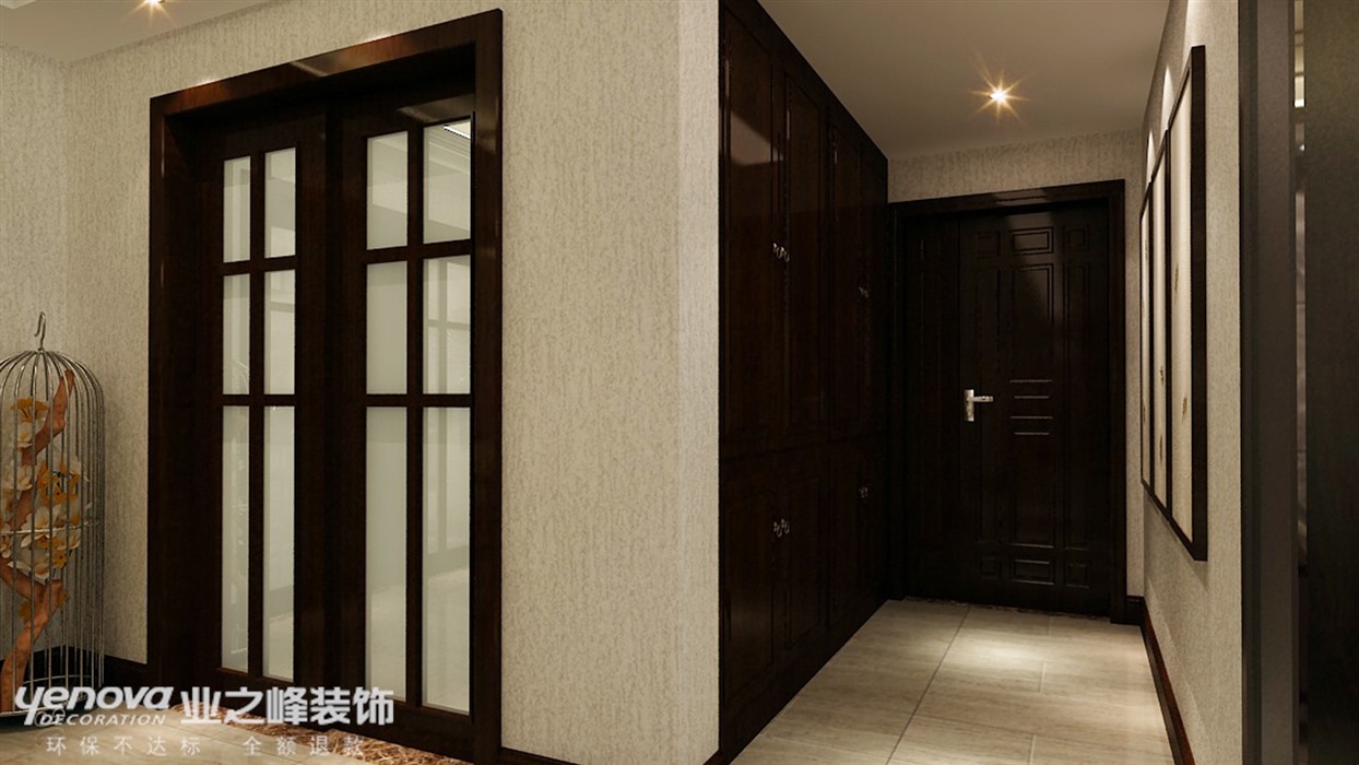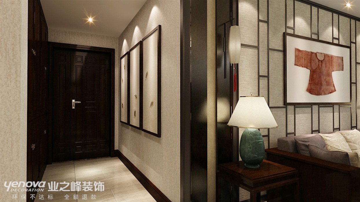 此方案展示的是中式风格,与其说是中式风格不如说是中国文化的一种展现,通过半月门做成的隔断将整个空间的格局确定下来,似透非透营造朦胧的感觉,有不失通透感,中国古代园林建设中有借景一说,想必这也是很好的展现了吧。木头雕刻的回字纹精致而大气,写满行书的壁纸,仿佛让人们问到了一股墨香,如此清新素雅,何乐不为。