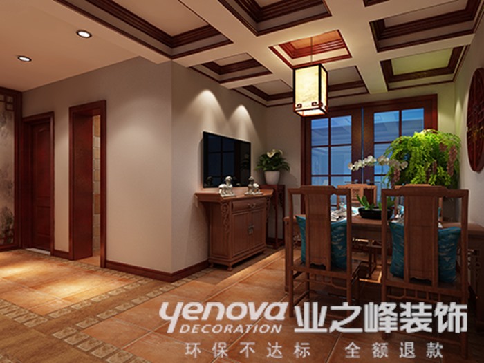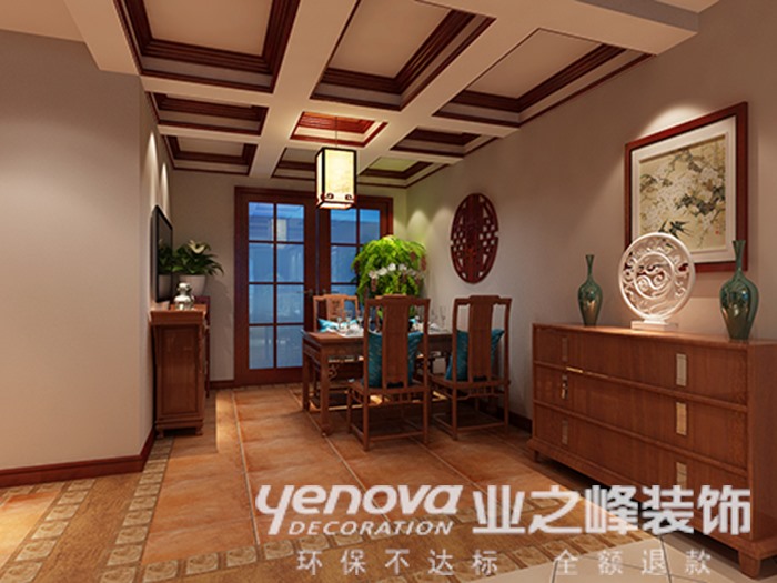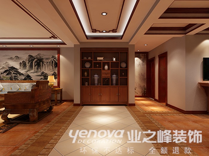 设计说明:本案的设计风格中式风格,此户型是客厅超大,餐厅却超小,对于这个面积的房子户型来说是不舒服的。所以在考虑设计时,我们在客厅多出了个过道的区域,形成客厅餐厅走廊分区明确,餐厅墙本身就小,现把餐厅通过地面和顶面的造型进行了扩展,餐厅扩大,合理的吊顶把餐厅顶上方的梁弱化削减。改造完的户型整体的比例就相对的舒服多了,满足业主一切的使用需求。