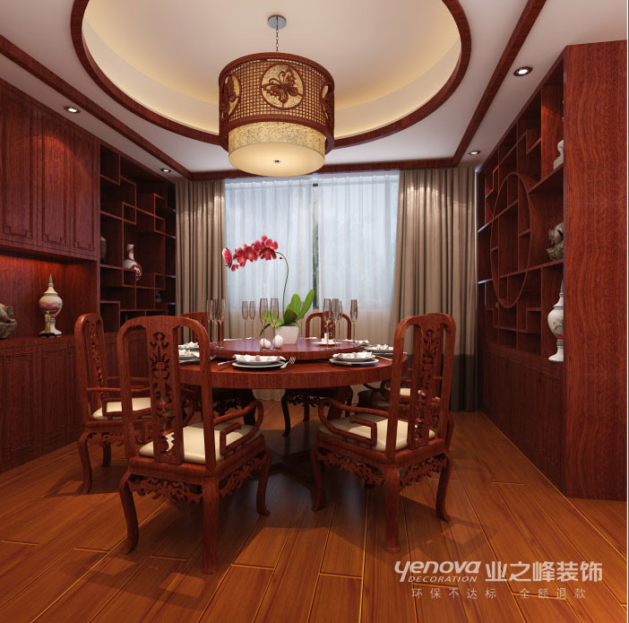 新中式风格讲究纲常,讲究对称,以阴阳平衡概念调和室内生态。选用天然的装饰材料,运用“金、木、水、火、土”五种元素的组合规律来营造禅宗式的理性和宁静环境。