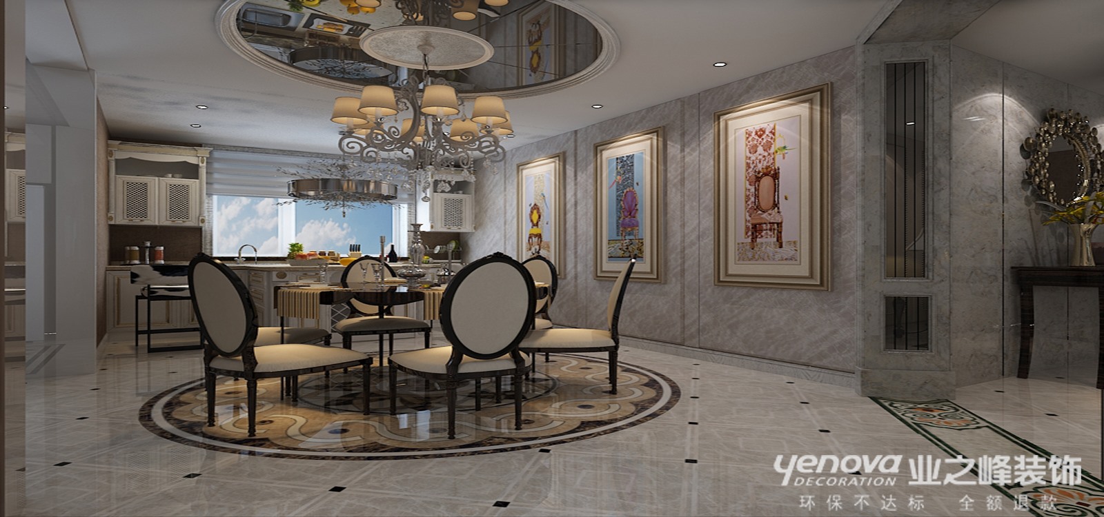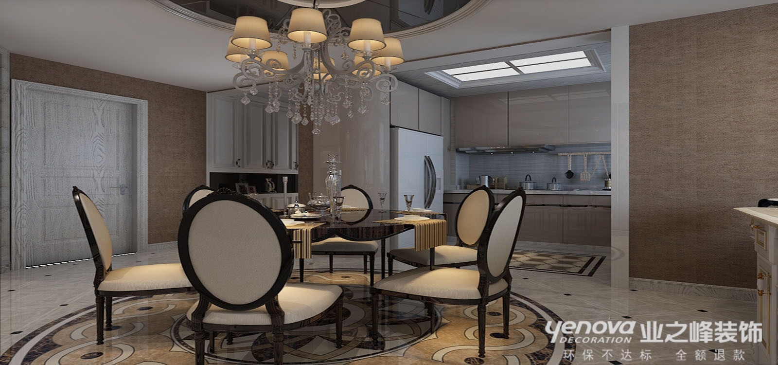 这款欧式风格餐厅设计在颜色上以浅色为主,整个餐厅没有加入多余的装饰,实木的餐桌搭配白色的皮质椅子,既时尚又大方。吊顶的设计采用了两个圆圈重合的设计,大方又富有层次感,餐桌上的鲜花又显几分温馨。
