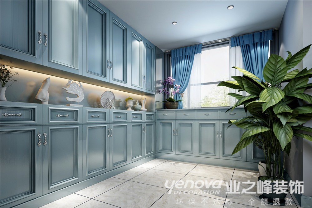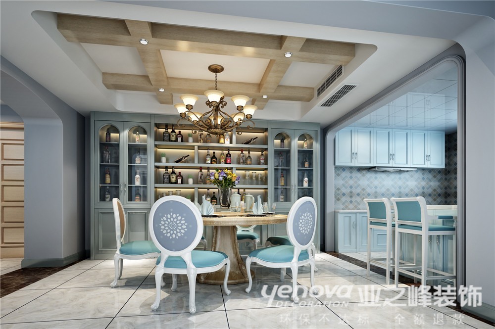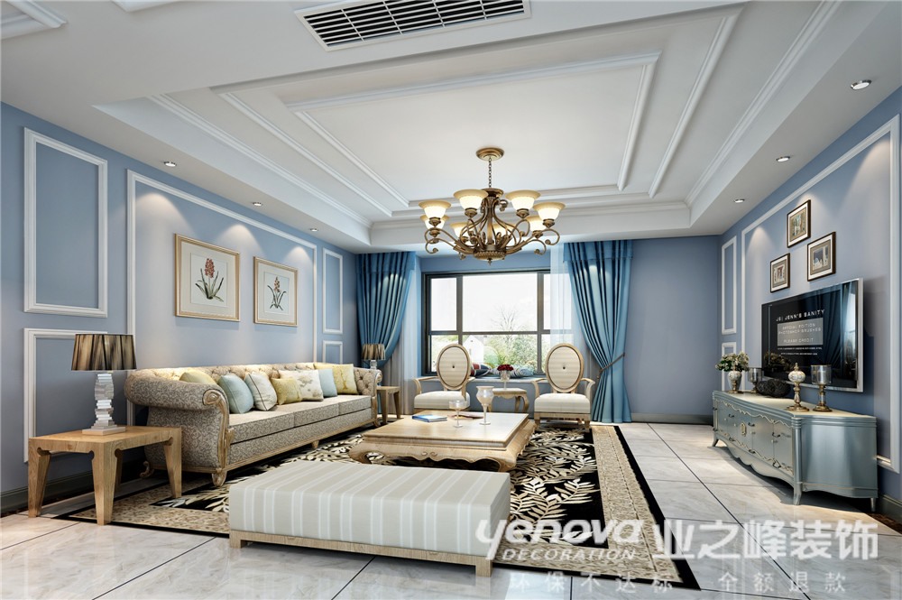本案采用简约美式乡村风格,虽然没有欧式的精致,也没有地中海的风情,但是由于美式没有太多造作的装饰,不经意间传递出人们所追求的自由自在,随意不羁的生活方式。浪漫温馨,给人带来一种清新、安静之美。优质的设计感使质感蔓延、自然纯净。淡雅的蓝、纯净的象牙白作为空间色系的主调,以简约精致的结构为基底的一个空间。空间的色调搭配显得主人有那么一丝丝俏皮的新意。然而空间中选用了看似很清雅的色彩构成语言去碰撞红橡古典家具精致氛围,这两种截然不同的方式融合在了一起,使人感觉到时间从肩头划过。冷暖色调交映出主人的自由气质,带来温润和暖的美意。客厅的左边是餐厅,光线穿过玻璃门让西厨和餐厅显得通透明亮,让爱甜点的女主人如鱼得水。通过过道最里面的房间便是主卧,盖条柔软的毛毯,就这样静静靠在床边打盹,时间与我无关。