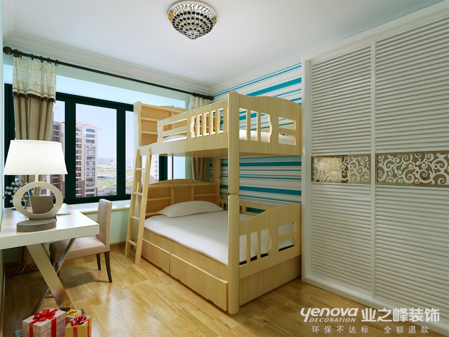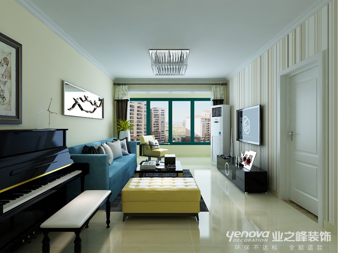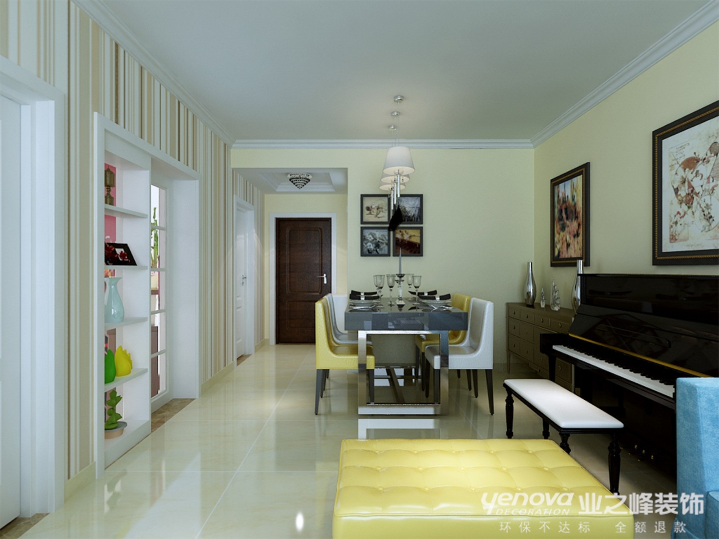 此方案的风格倾向定位为现代简约风格。空间组织不再是以房间组合为主,通过家具、吊顶、地面材料、陈列品甚至光线的变化来表达不同功能空间的划分,而且这种划分又随着不同的时间段表现出灵活性、兼容性和流动性。条纹状壁纸与黄色家具配饰的使用,使空间更加丰富与温馨。简约主义所崇尚的正是通过流动的线条、质感的材料及整体协调搭配让人在日趋繁忙的生活中,得到一种能彻底放松、以简洁和纯净来调节转换精神空间。