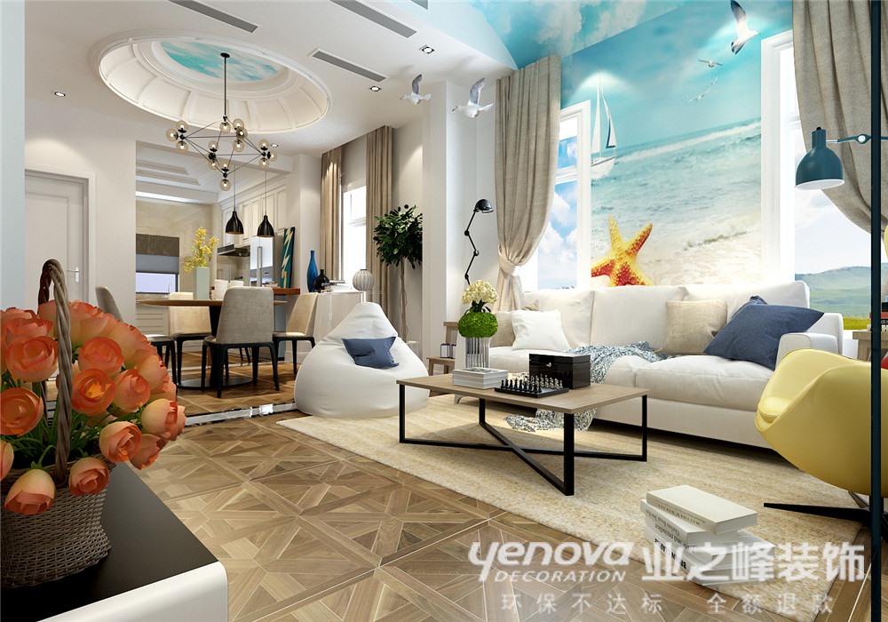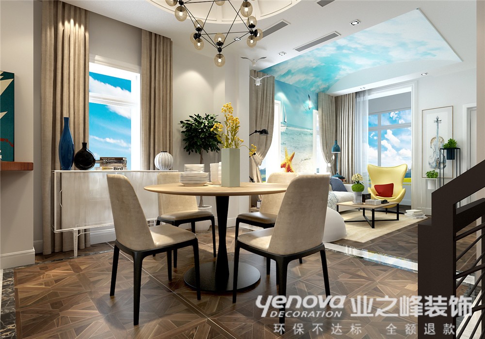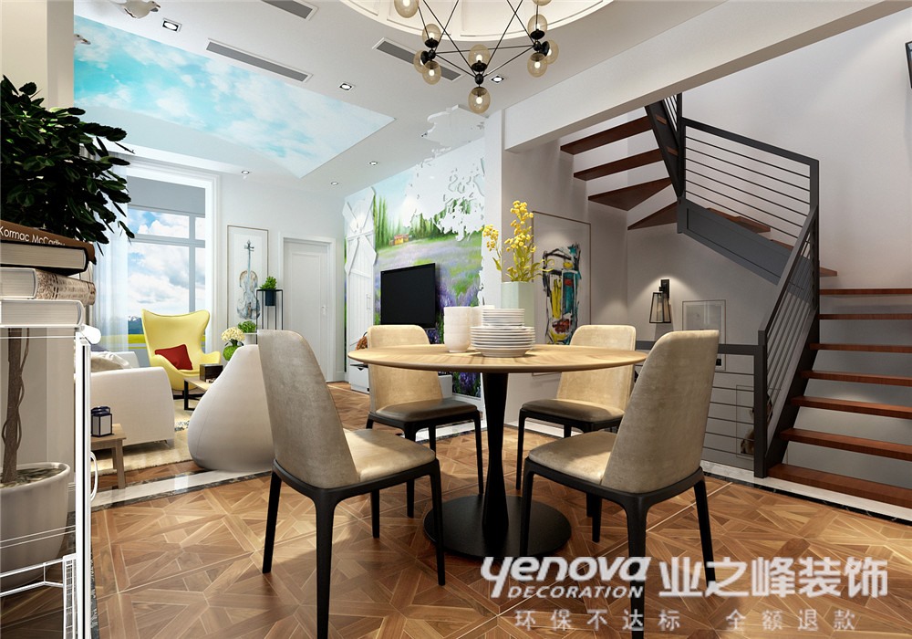 二楼的格局相对来说比较重要,再结合北欧风格的同时穿插风水的元素,构思方向:1.卫生间的门在于客厅的电视墙上。2.沙发背景墙与窗户的结合。3.餐厅与厨房的结合,小吧台的位置摆放。以及空调出风口的位置确定等等(包括净水系统,热水系统的循环,智能监控 ,改通气下水管道等等)飞行图套盘分析财位,官位,文昌及平安位。北欧风情中的简约又不失格调,文艺气息中充满了舒适与休闲。缤纷的色彩搭配来烘托家的氛围感,同时又充满了趣味性。电视墙则采用了隐形门的形式,在普罗旺斯的氛围里有一扇风车、有一颗大树并配以薰衣草的浪漫。沙滩手绘墙与窗外蔚蓝天空的结合,并配以暖色的窗帘及微深点的地板色彩,来使整体的色调落地,从而拉开整体的画面感。