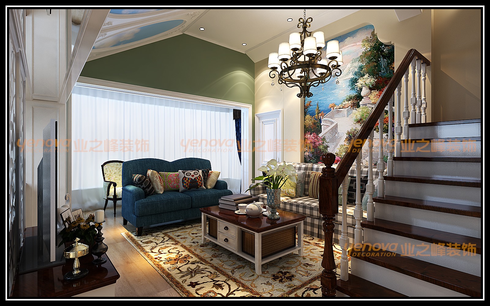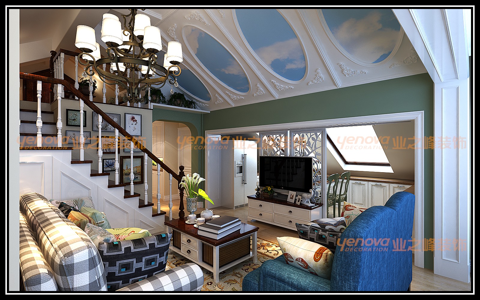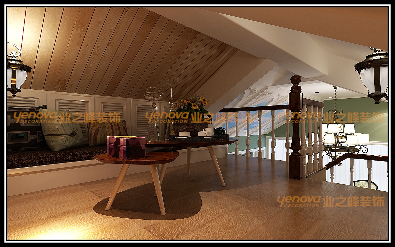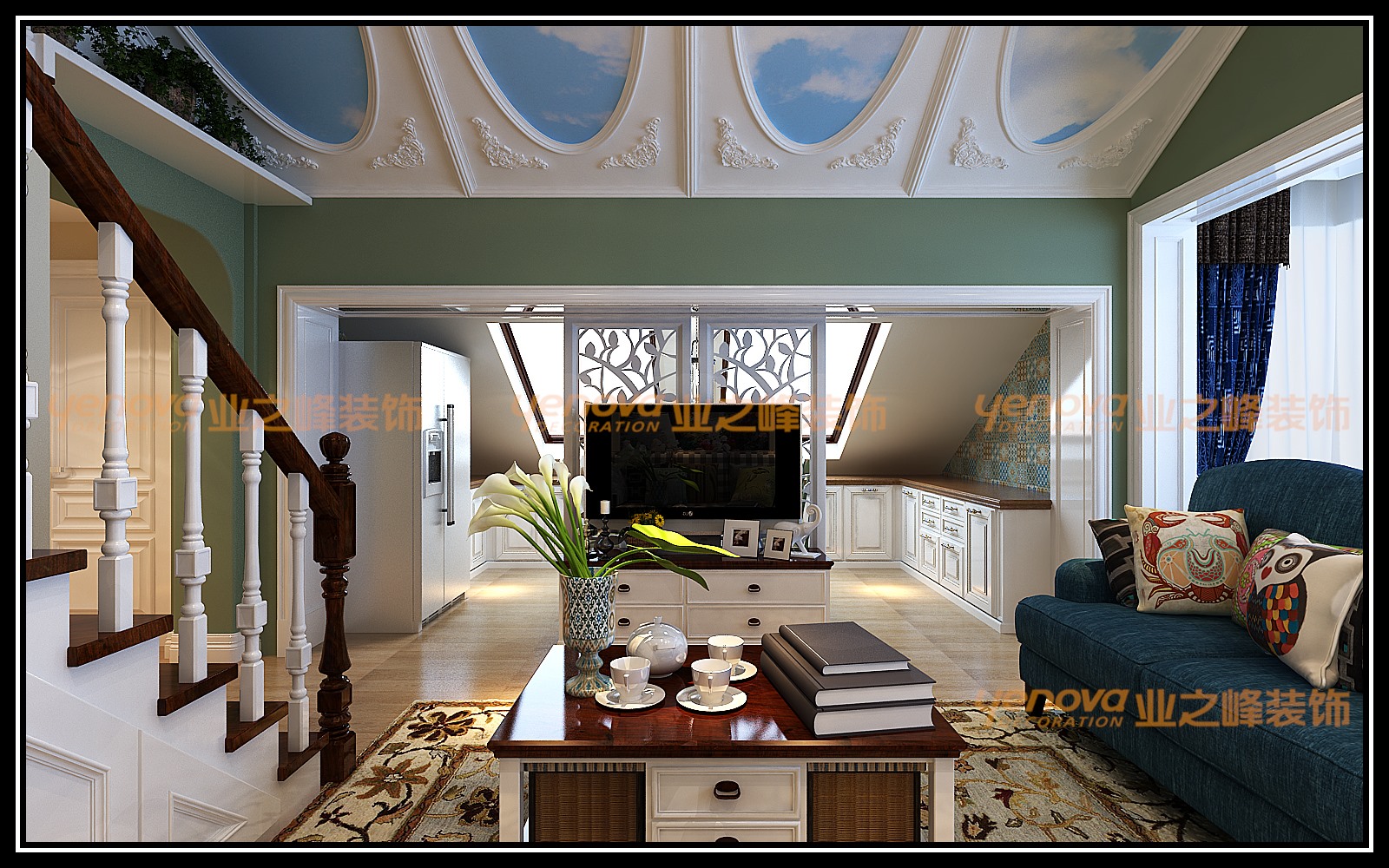 一提起美式田园的风格大家立刻就会想到碎花、原木、绿植……。设计师在本案中打破了以往的元素,但任然营造出田园的那份休闲与惬意。另外设计师对斜面屋顶的处理增加了新意,保留了美式的石膏线的造型与蓝天白云的壁纸的结合营造出一种别有洞天的效果,犹如房顶开了天窗一样。在材料的运用上设计师运用了纯色的墙面衬托白色的木作,沙发背景应用了造型与手绘画相结合,在空间上有一种别有洞天的营造感。在结构上由于客户的职业需要一个独立的看书空间,于是在二层的有限空间内除了保留了储物空间外又增加了一个读书休闲厅。