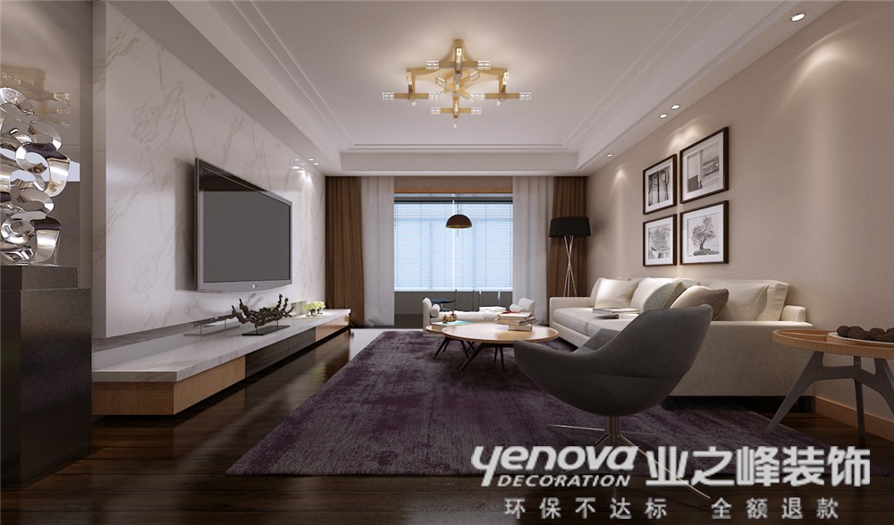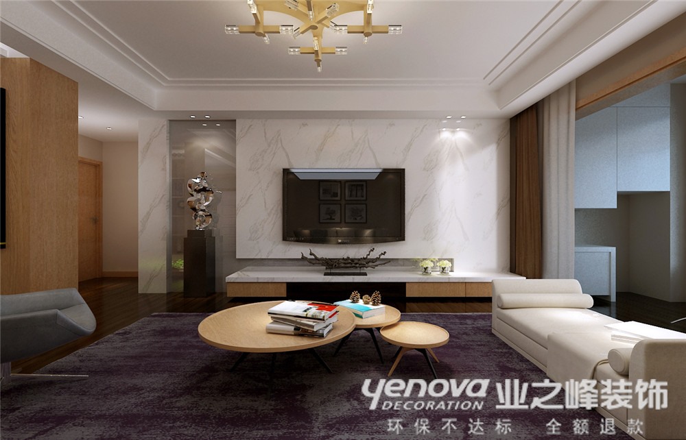 作为突出效果的影视墙,采用了大理石,色彩调配为灰白色调,不仅能融入整个空间,大理石的质感也给简约风格提升档次。