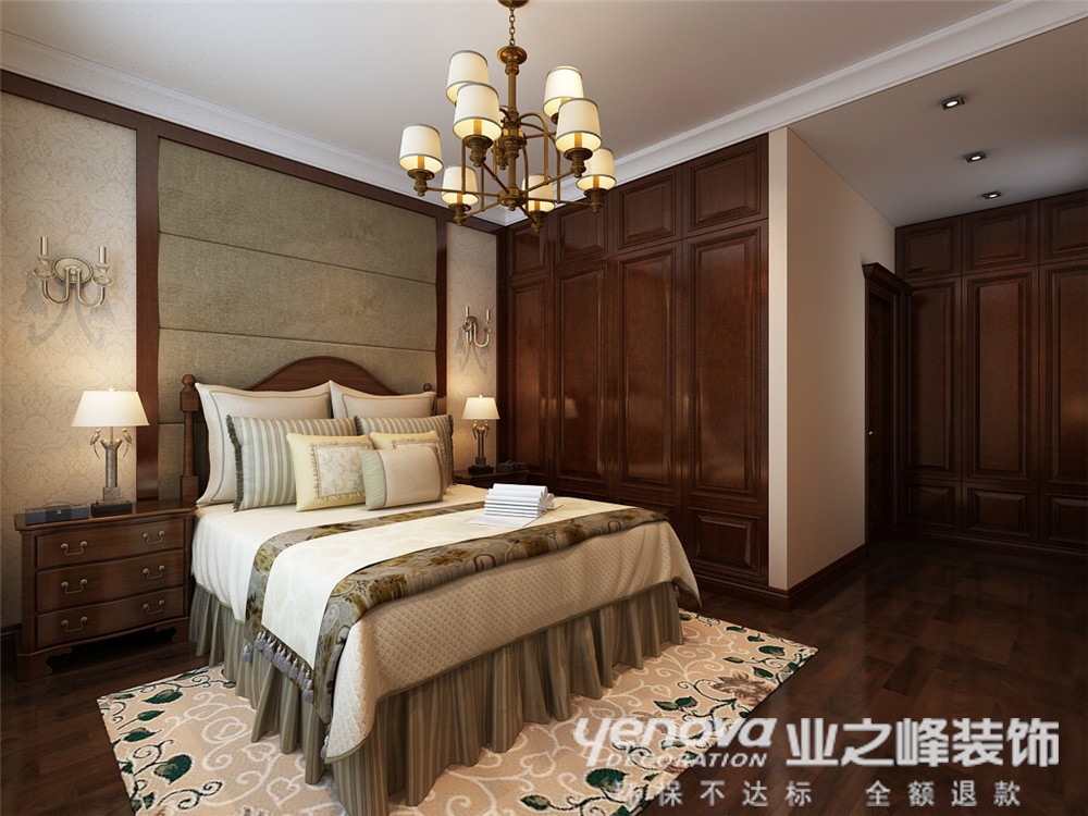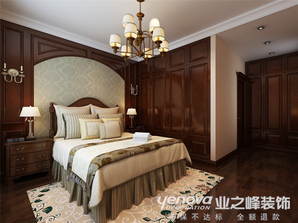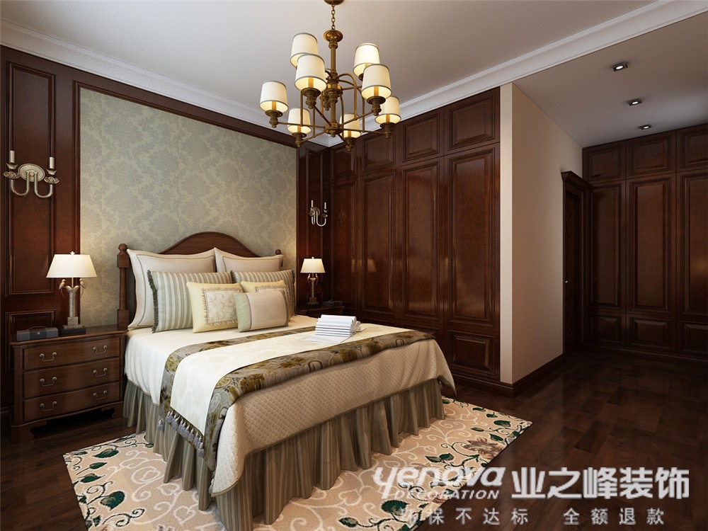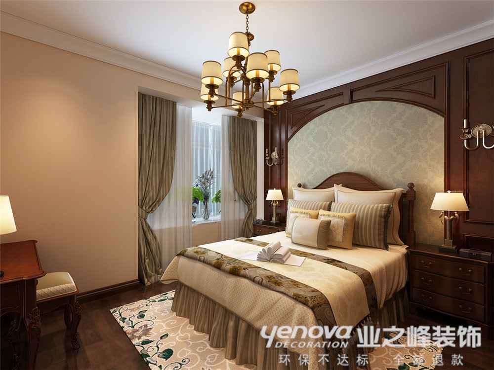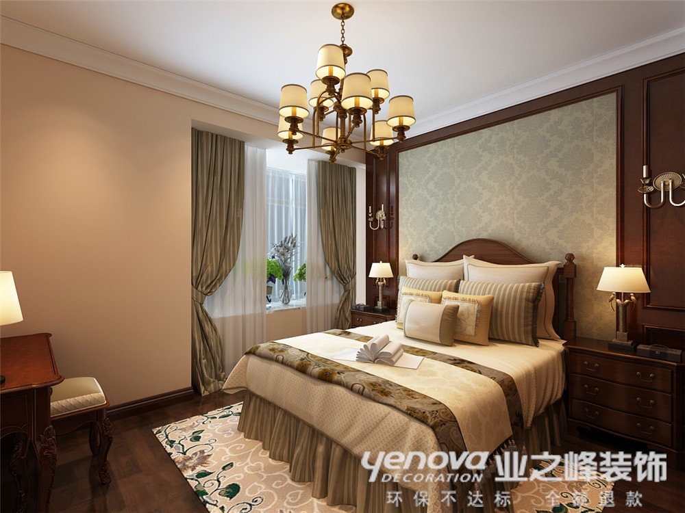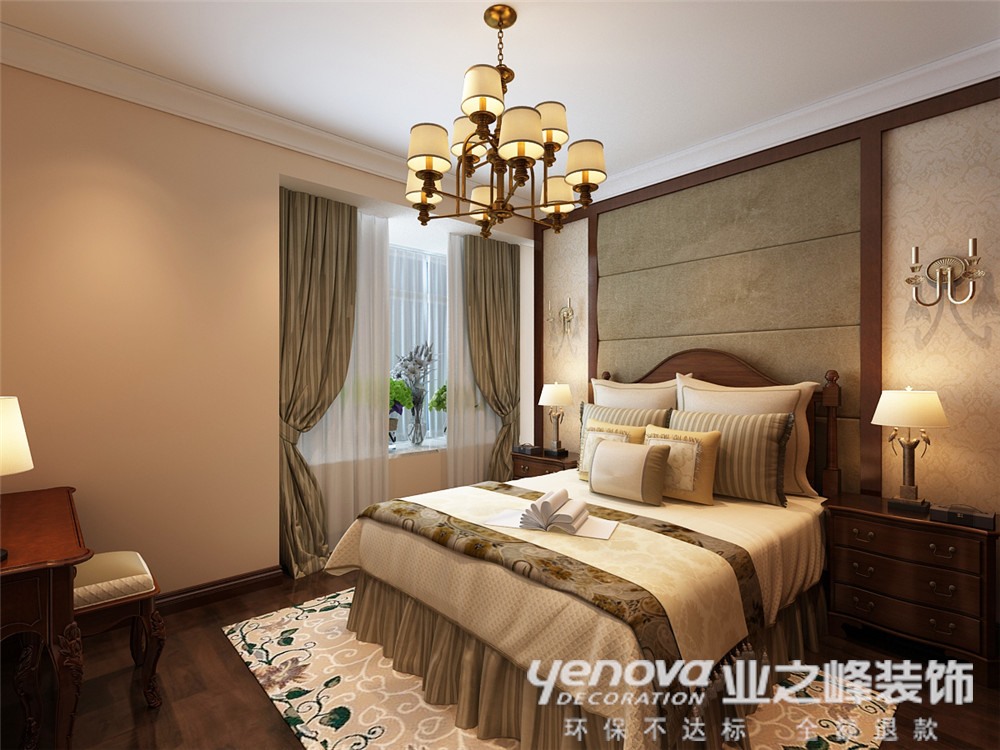 客厅风格较多采用嵌入式石膏吊顶,搭配精致的铁艺美式吊顶,营造出一种怀旧、浪漫的感觉。以大理石作为地面装饰材料,光泽感极佳,在沙发区铺上大幅花纹地毯,使空间区域划分更加清晰。复古造型的组合沙发,以及茶几都具有上乘的质感,让美式古典风格得以进一步的彰显。窗帘采用双层设计,一层为奢华的提花布,另一层则为轻薄的纱帘,兼顾了保护隐私与透光性。卧室以功能性和实用舒适度为主要设计理念。采用非炫目式灯光,显得温馨舒适。在饰品布置上,大多都是用成套的布艺来装饰房间