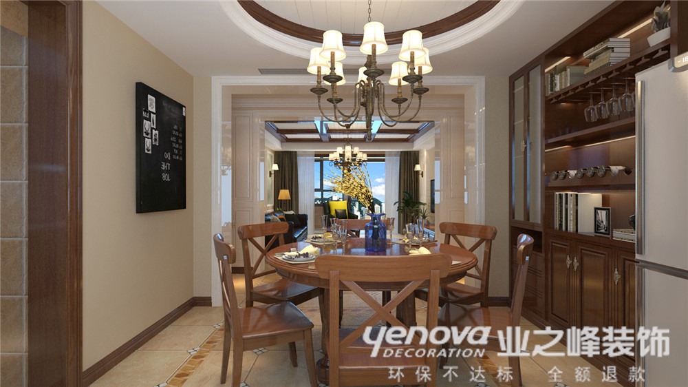 走廊过道用木质垭口套,这样更见美观,衔接的更好,客厅采用的是一个木制的九宫格吊顶,男主喜欢品酒在餐厅西墙做了一组酒柜,女主对储物空间要求很明确,所以在一层主卧对面单独做了一个衣帽间。