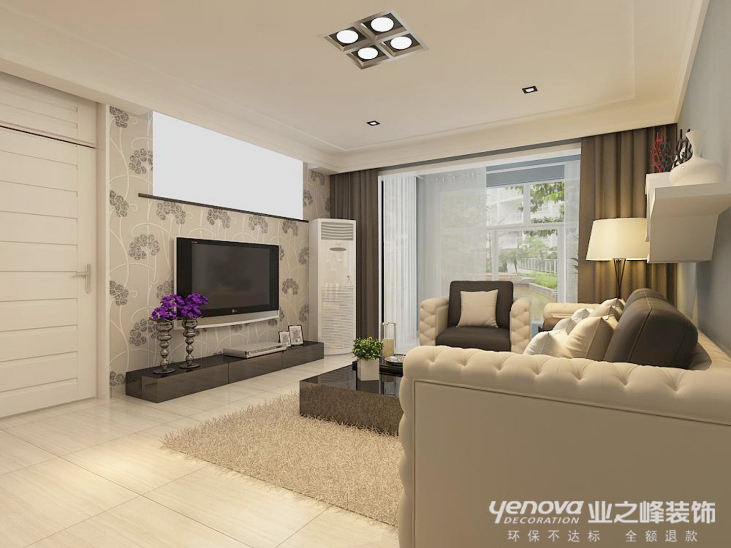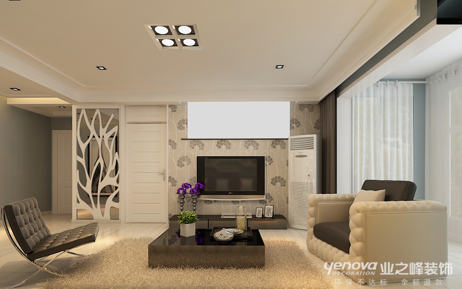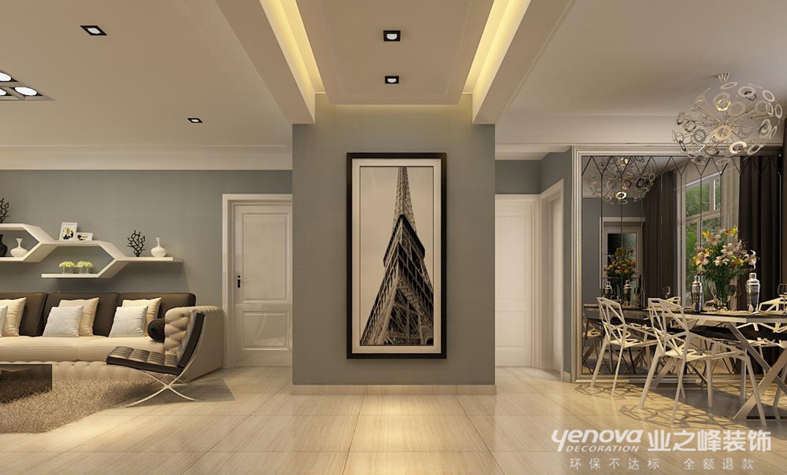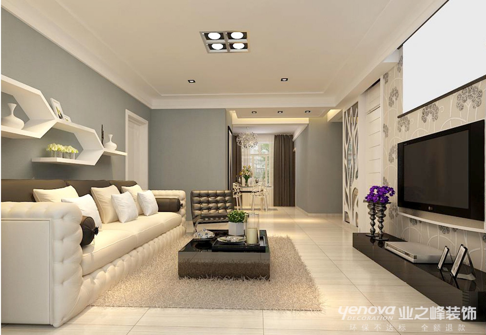 此方案的风格倾向定位为现代雅致风格。一入户 迎面一玄关 ,玄关中灯光照射着现代雅致的壁纸奇特的造型,给人以温馨,高雅的感觉 。客厅中电视墙的简单大气,餐厅中运用了木地板的时尚造型,和整个方案衔接融为一体,居室中所出现的电器皆为紧跟时代潮流的产品如等离子电视等。本案的设计重点是会客空间与门厅、餐厅以及过道空间互通与交流,从设计手法上采用了从墙面上的线与面的衔接呼应,以及顶面的空间的虚拟划分,达到各功能空间融会贯通的目的。时尚、高雅,的设计本案中得到了淋漓尽致的体现