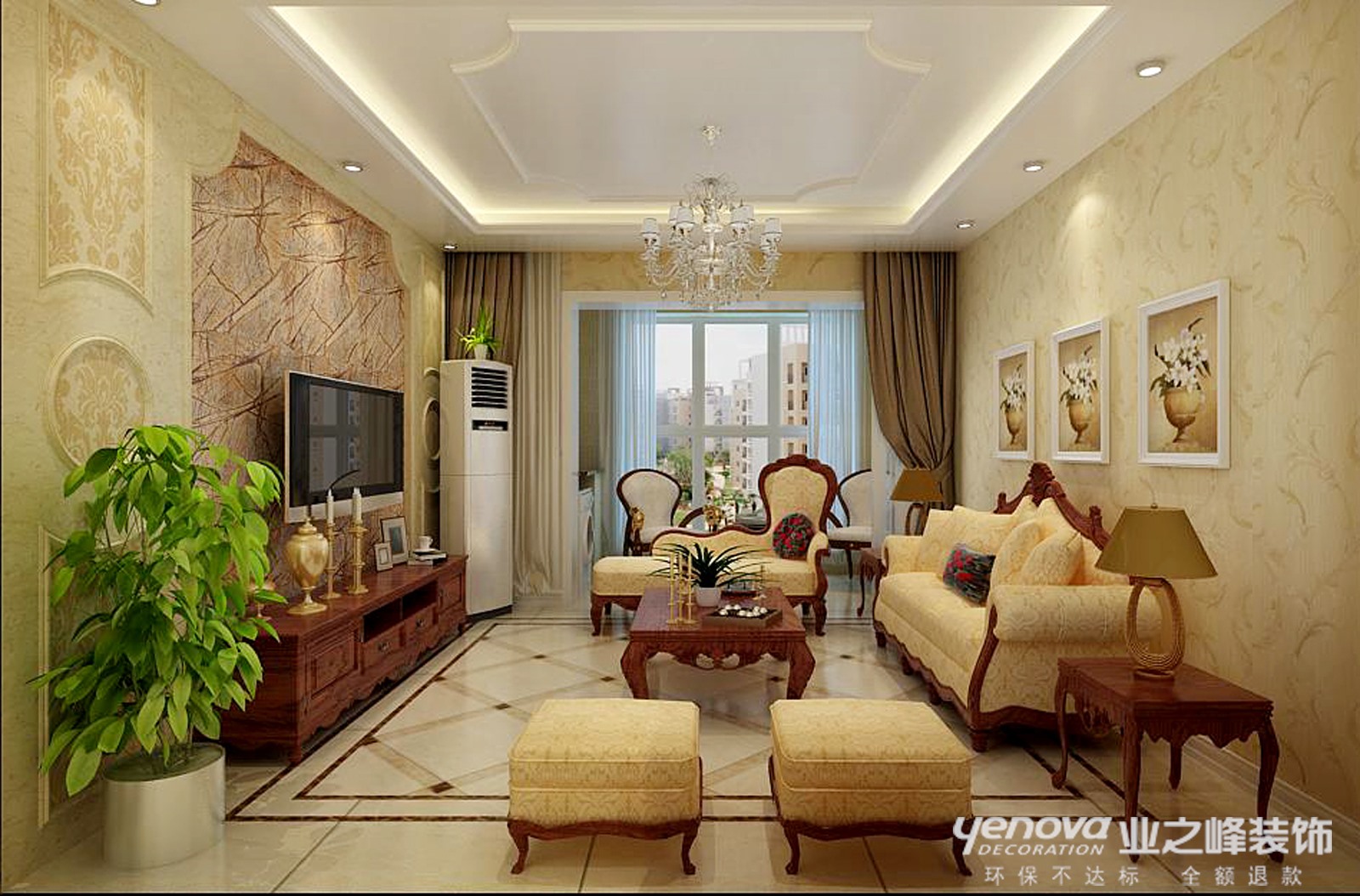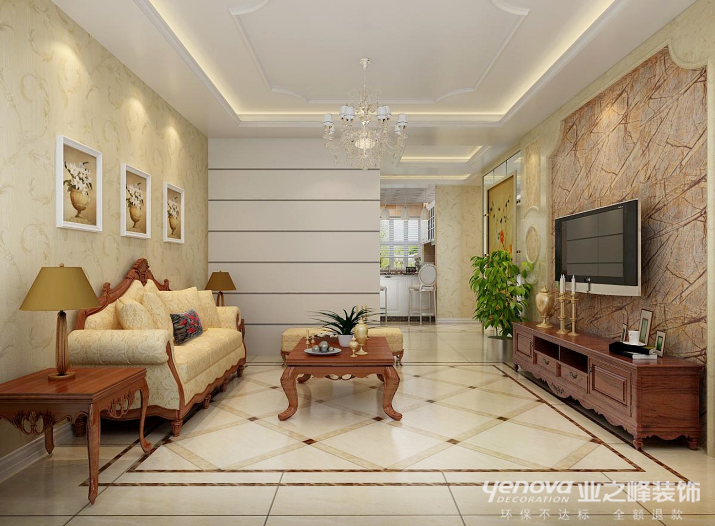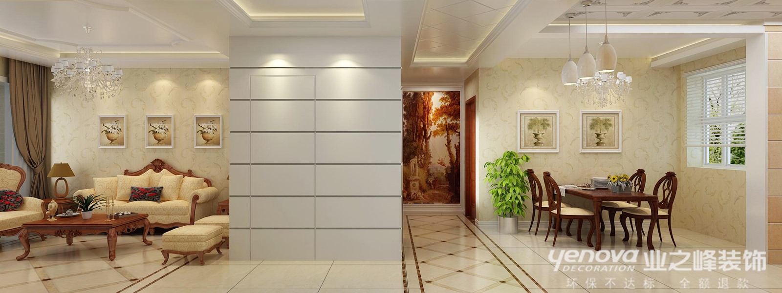 设计说明: 本方案是面对这一对中年夫妇,设计师以欧式为空间的主导风格,用简约的塑造方式,简化欧式繁复的线条。淡化了欧式的富丽堂皇,吸取其舒适情怀。配合简单淡雅墙面壁纸,让空间弥散出淡淡的温馨,同时给人与优雅的视觉感受。搭配上新古典的家具,让家少一份浮华,更多了一份历史与归属感。