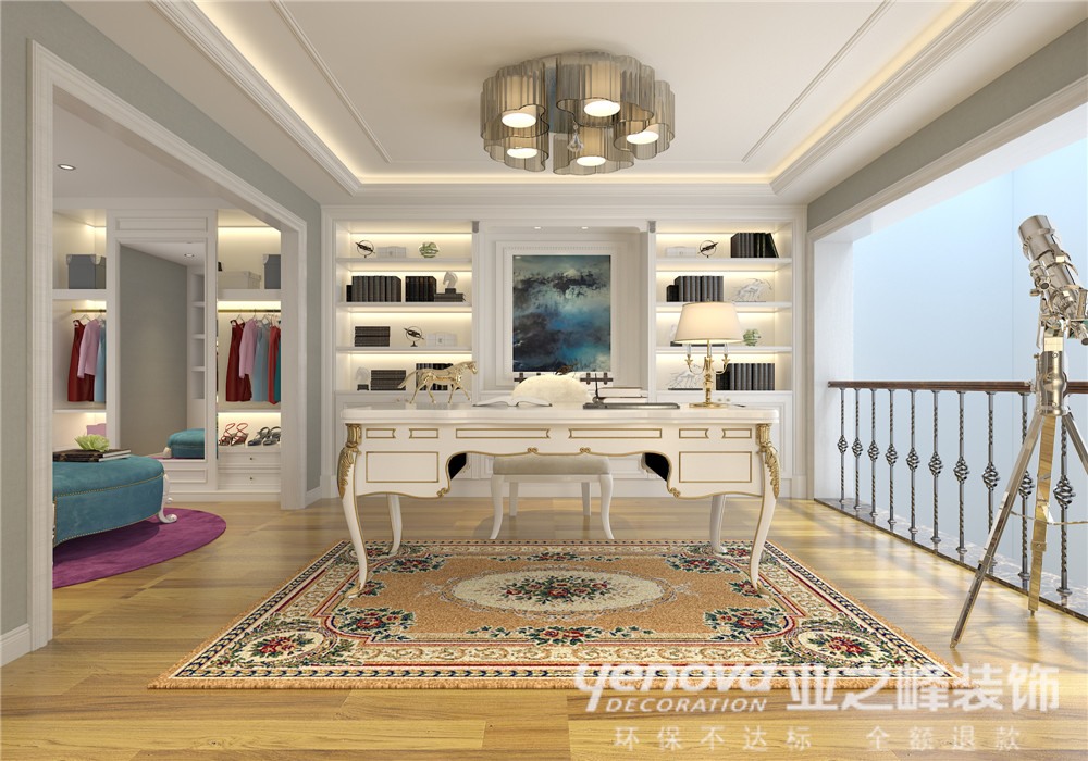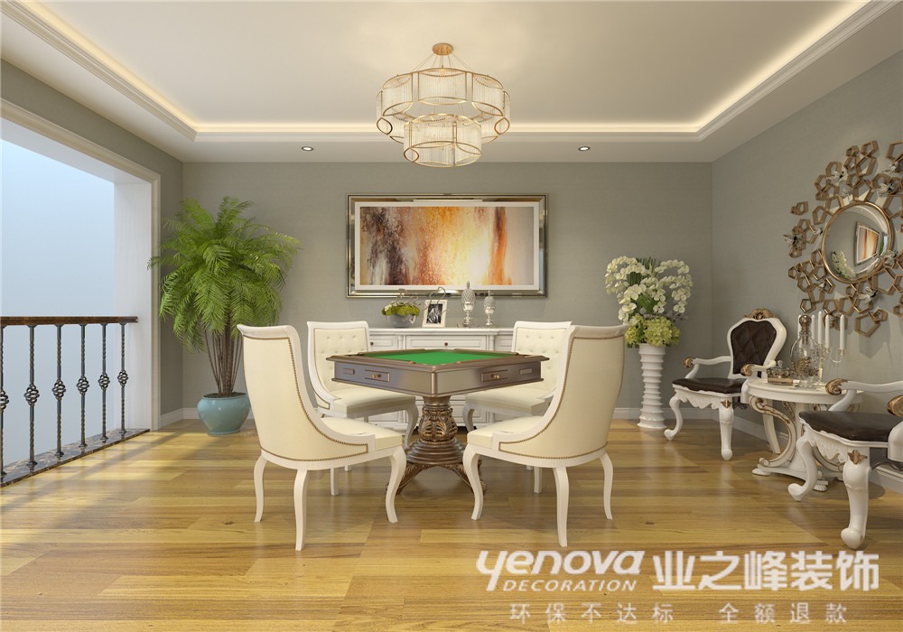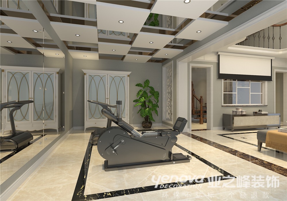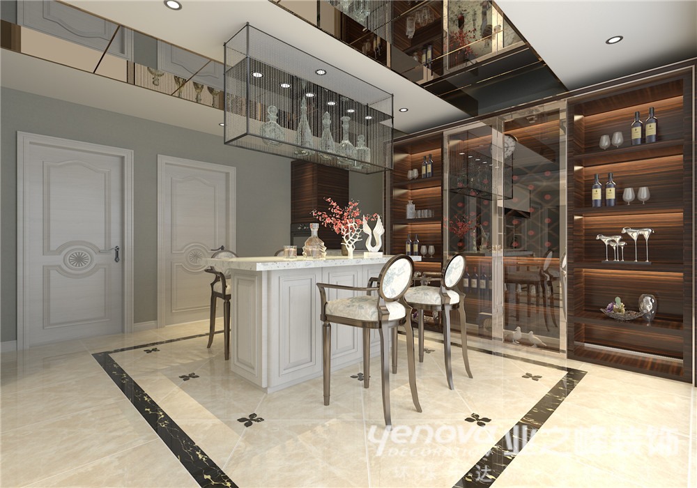 设计手法上从整体到细节,从空间到平面都沿用了现代风格和欧式风格中的经典造型。材质方面墙板、门板都采用了白色封闭漆,保留了木材的天然纹理,配合现代感十足的壁纸,凸显整个风格中的清贵、舒雅,电视背景墙没有采用护墙板全包而是使用大面积的硬包,使用银色和香槟色不锈钢作为点缀,使得立面层次感更强,酒吧区和健身区顶面使用部分镜面做装饰,延伸视觉空间的同时,起到点亮空间的作用,二层衣帽间空间敞开,与书房空间交相呼应,使整个二层灵动感十足