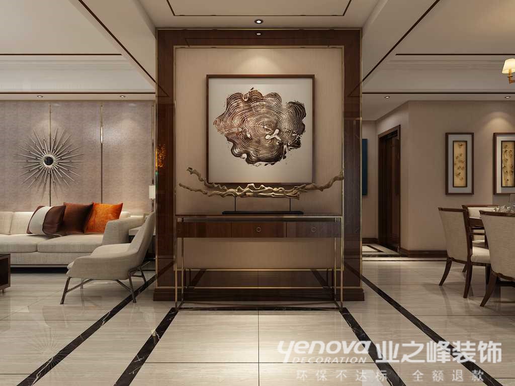 本案设计为现代中式,整体上以现代空间的构成手法,在细节上用概括的传统中式符号,塑造出一个现代的新中式空间。结构上增加了储物的衣帽间,改造出入户玄关,在保证空间更具私密性的同时,又有中式一步一景的感觉,增加了整体空间的灵动性。玄关隔断用现代的不锈钢元素似透非透,视觉的延伸使空间不再局促,同时和顶面造型线条相互应,使整体的空间更具连贯性。