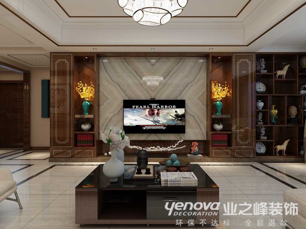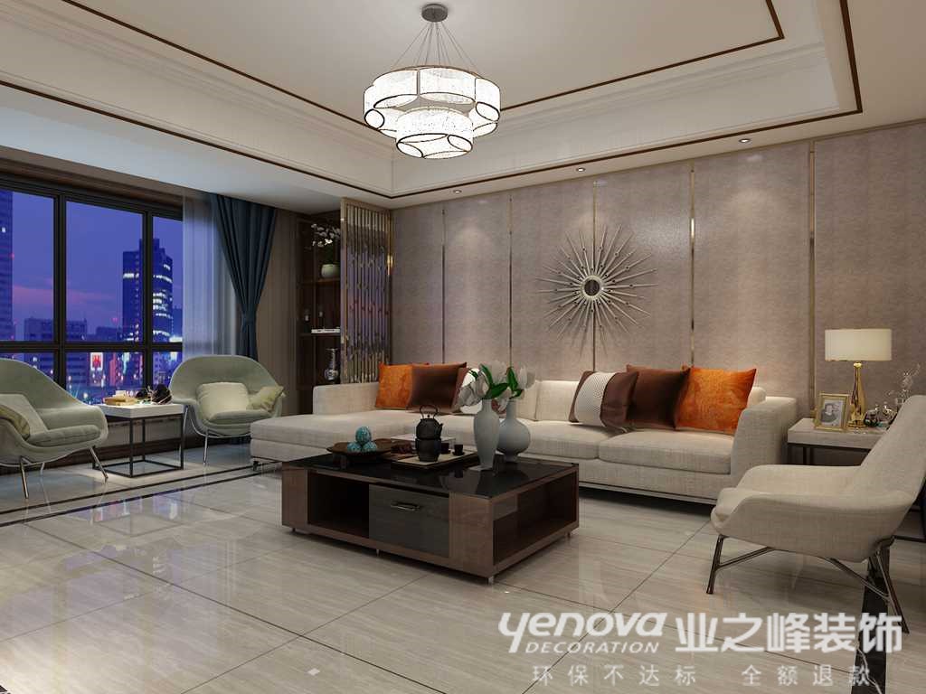 色彩方面大面积整体采用咖色,体现了中式风格的沉稳,在米白的沙发点缀橙色的靠包,使空间在沉稳大气中突出活力。