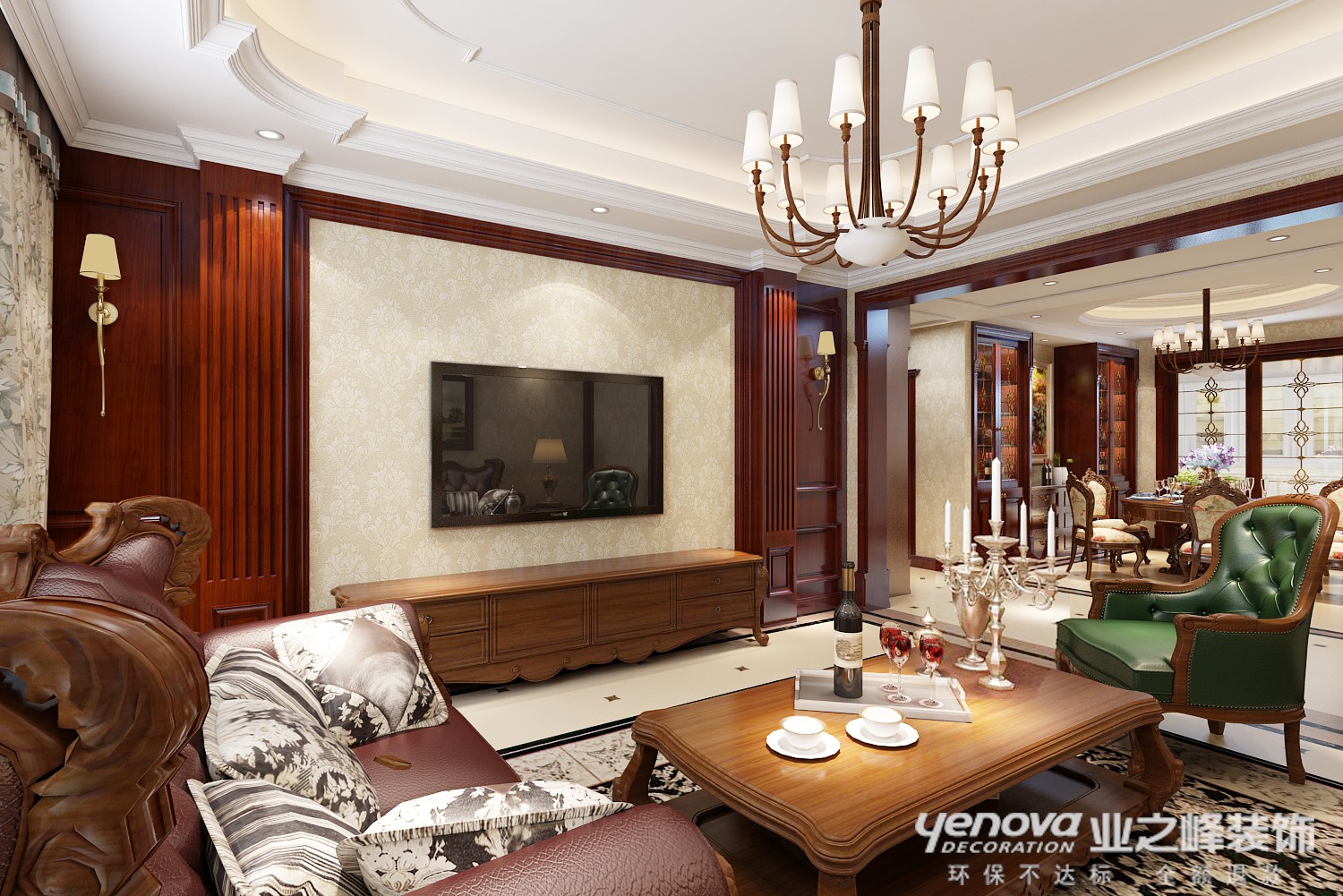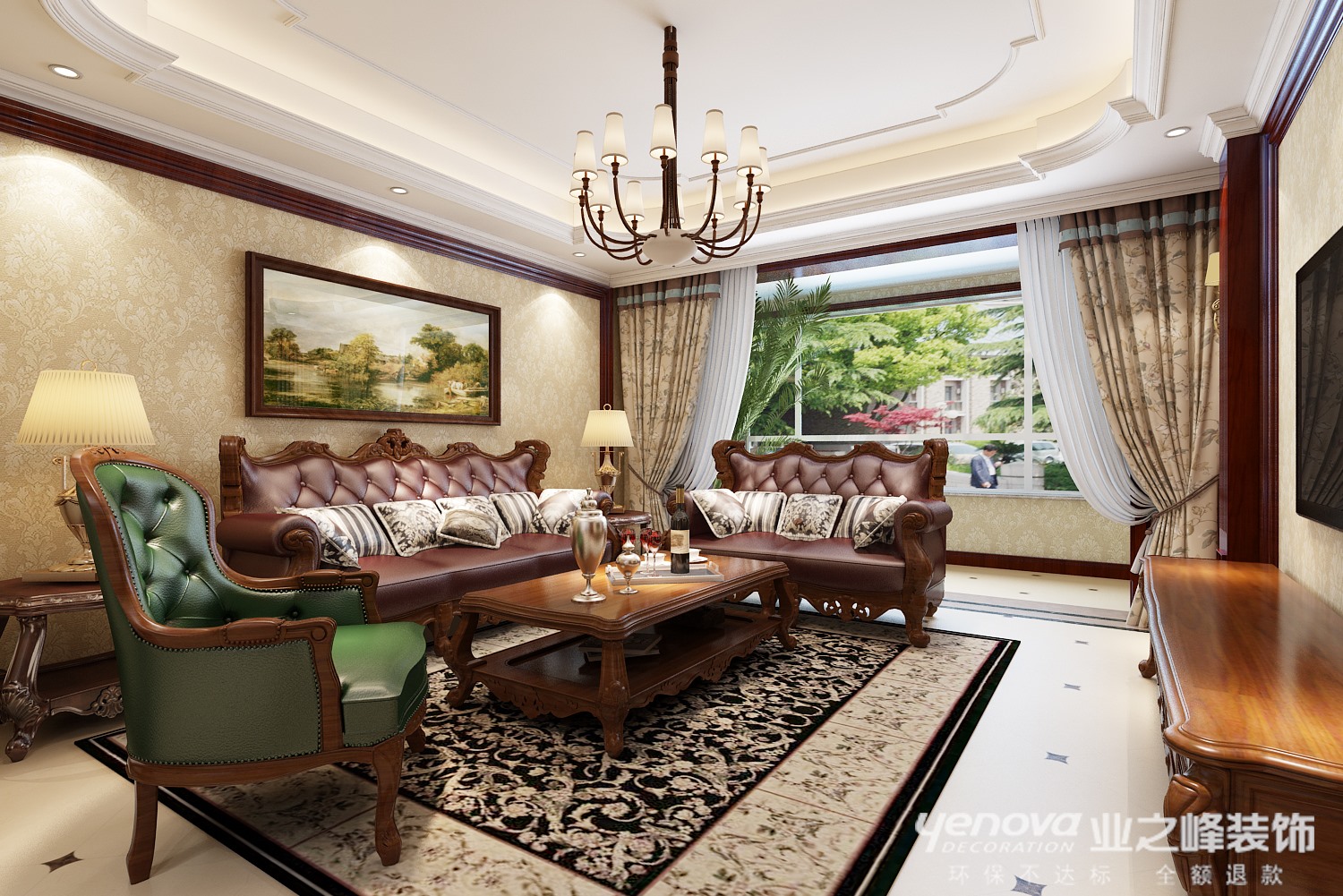 客厅作为待客区域,一般要求简洁明快,同时装修较其它空间要更明快光鲜,使用大量的石材和木饰面装饰。美式田园风格的客厅是宽敞而富有历史气息的。