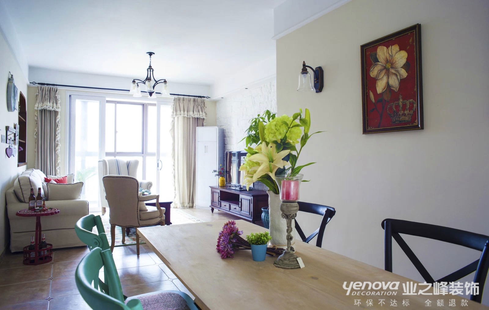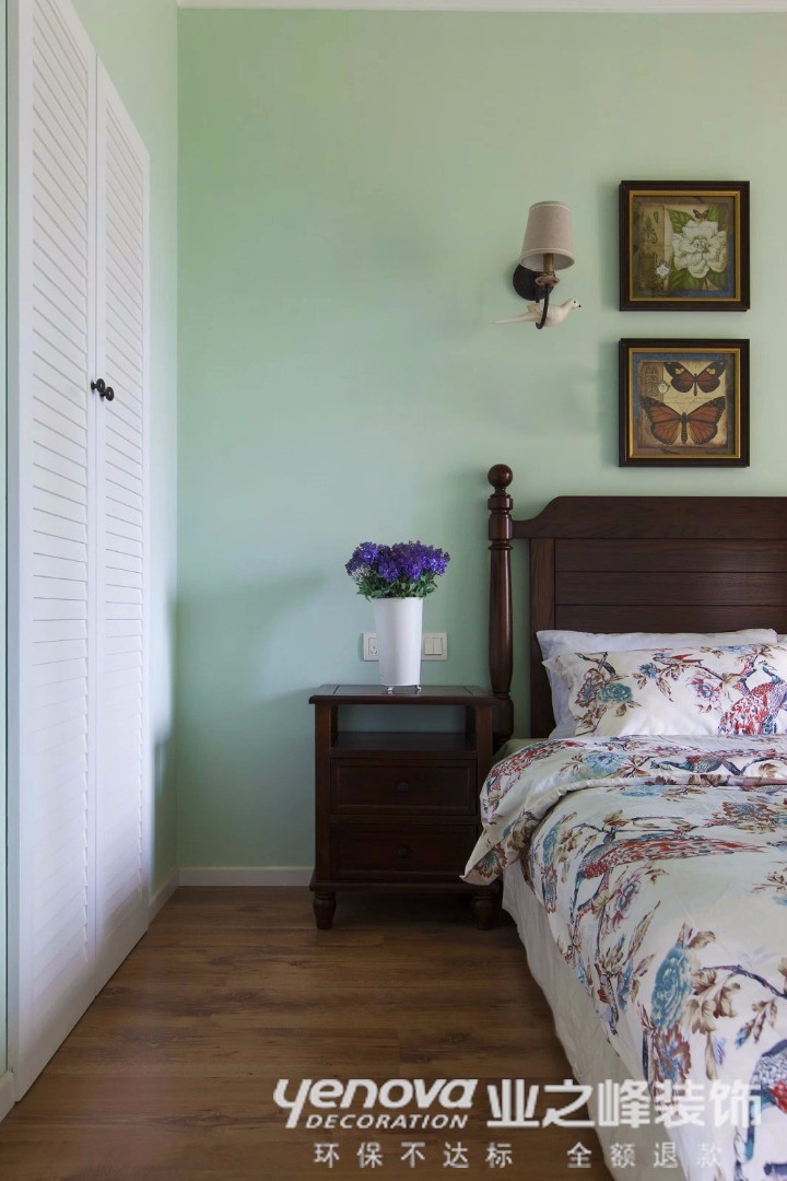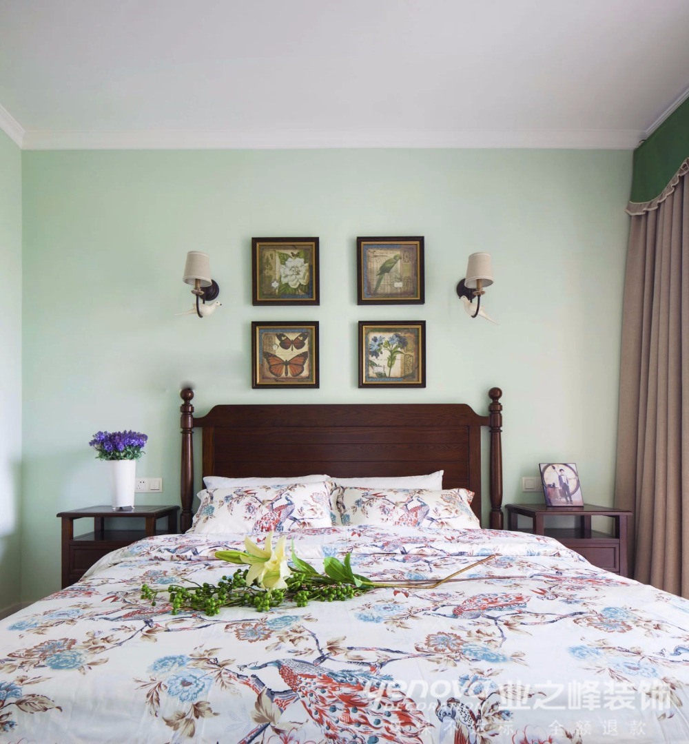 客厅作为待客区域,一般要求简洁明快,同时装修较其它空间要更明快光鲜,通常使用大量的石材和木饰面装饰;美国人喜欢有历史感的东西,这不仅反映在软装摆件上对仿古艺术品的喜爱,同时也反映在装修上对各种仿古墙地砖、石材的偏爱和对各种仿旧工艺的追求上。总体而言,美式田园风格的客厅是宽敞而富有历史气息的。