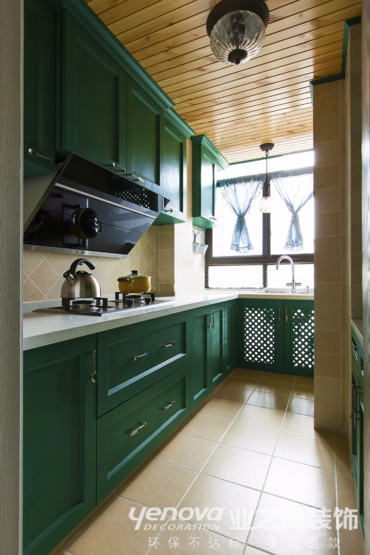 厨房在美国人眼中一般是开敞的(由于其饮食烹饪习惯),同时需要有一个便餐台在厨房的一隅,还要具备功能强大又简单耐用的厨具设备,如水槽下的残渣粉碎机,烤箱等。需要有容纳双开门冰箱的宽敞位置和足够的操作台面。在装饰上也有很多讲究,如喜好仿古面的墙砖、橱具门板喜好用实木门扇或是白色模压门扇仿木纹色。另外,厨房的窗也喜欢配置窗帘等。