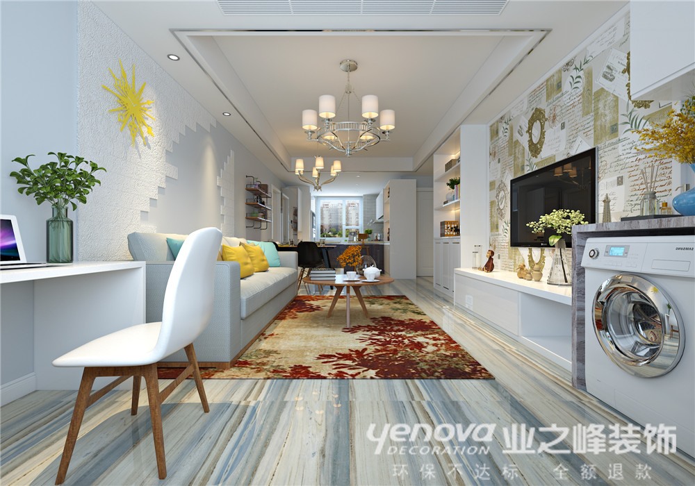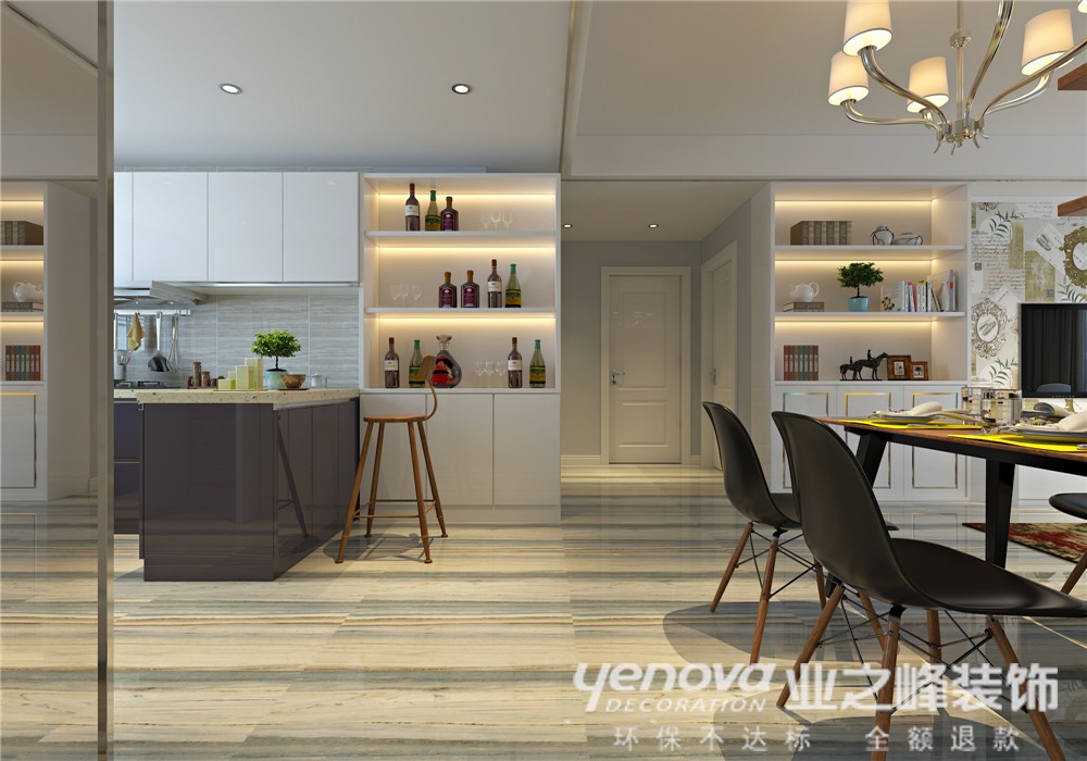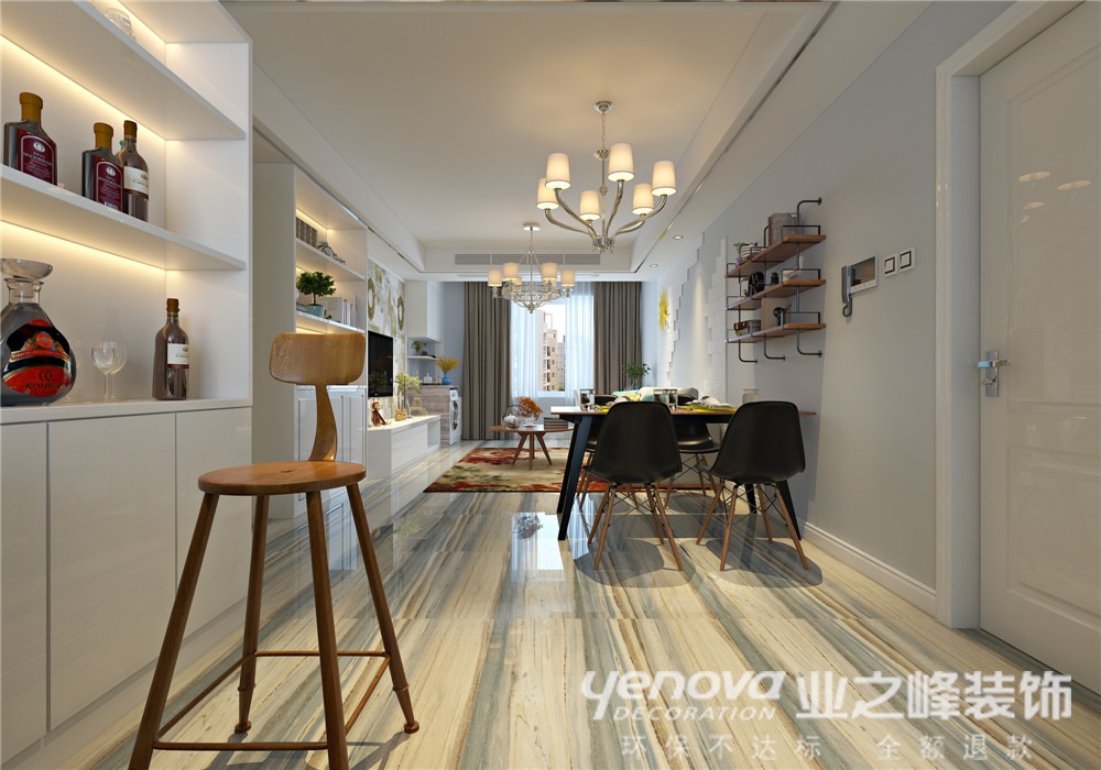 本案设计师根据业主诉求,选用现代风格的设计,于细节处彰显摩登都市的生活品质,在喧闹中享受内心的安宁。设计手法上,从入户门开始,用烤漆白色展示酒柜装饰柜和流线感蓝金沙瓷砖组合的现代气息,特意营造出一种“时尚户型图