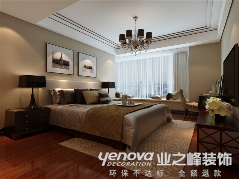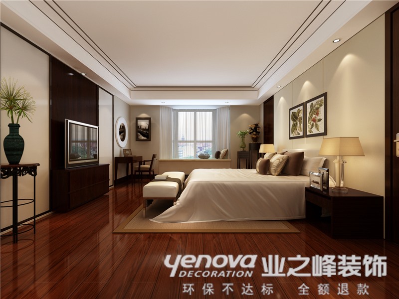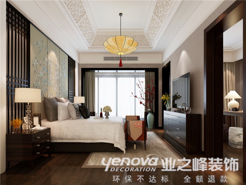 卧室的设计都是与客厅统一的新中式元素。传统的雕花窗格元素衍生而来,清晰的肌理,留白的的视觉效果,给人一种能“无为而无不为”的奇妙的效果。床头背景墙的中式的飞鸟墙纸,抬高了空间的优雅意境。东方特有的瓷器花瓶,花架,竹子,都给空间增加一抹不一样的东方韵味。