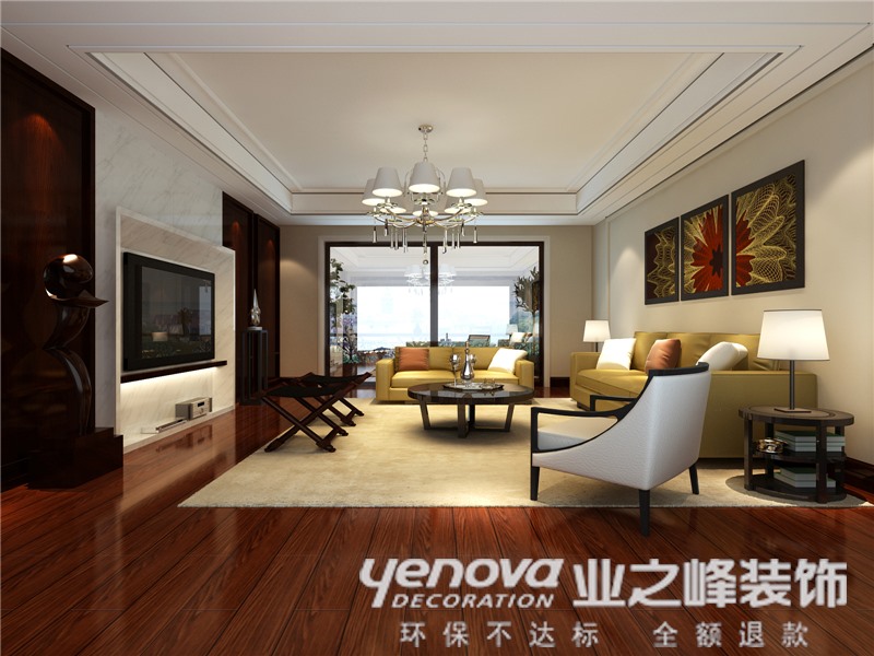 客厅中,大幅的石材山水画,高耸到上纱质窗帘,给空间增加一丝灵动与飘逸,增加视觉上的延伸。将新中式家具,电视背景墙对称的布局都显示了现代中式豪宅的气场,宽敞,明亮。通过成熟的运用稳重的色彩,适当的运用古典韵味的中式元素,如交椅,花格,和多宝格,沉稳阔气之中又带点古色古香的美感,发财树的绿与盆景中的红,增加一抹自然的色彩在里面。