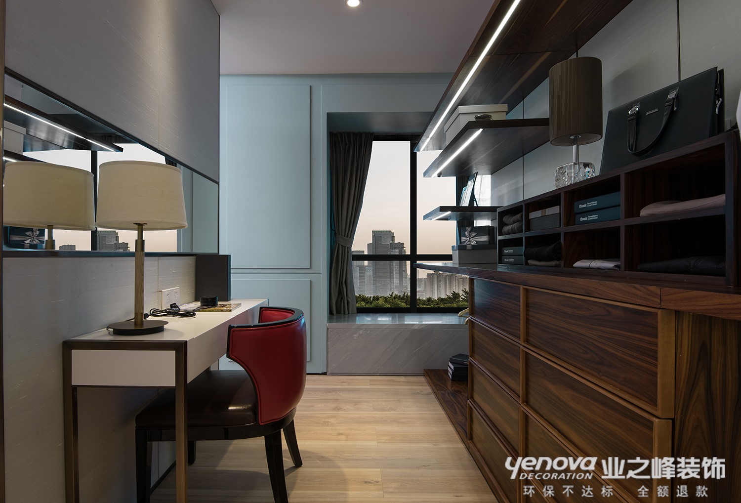 本案在原始结构上的十多米长的客餐厅区域,隔出了一个半开放的书房与衣帽间,恰到好处的解决了玄关的问题,空间墙面主要用材为乳胶漆,石膏线条,护墙板,墙纸,设计师通过客厅、餐厅全面考虑,在总体布局上方面尽量满足客户使用的同时,用壁纸的朴素大方来装饰墙面,凸显出了业主追求自然,崇尚乐活的生活情调!
