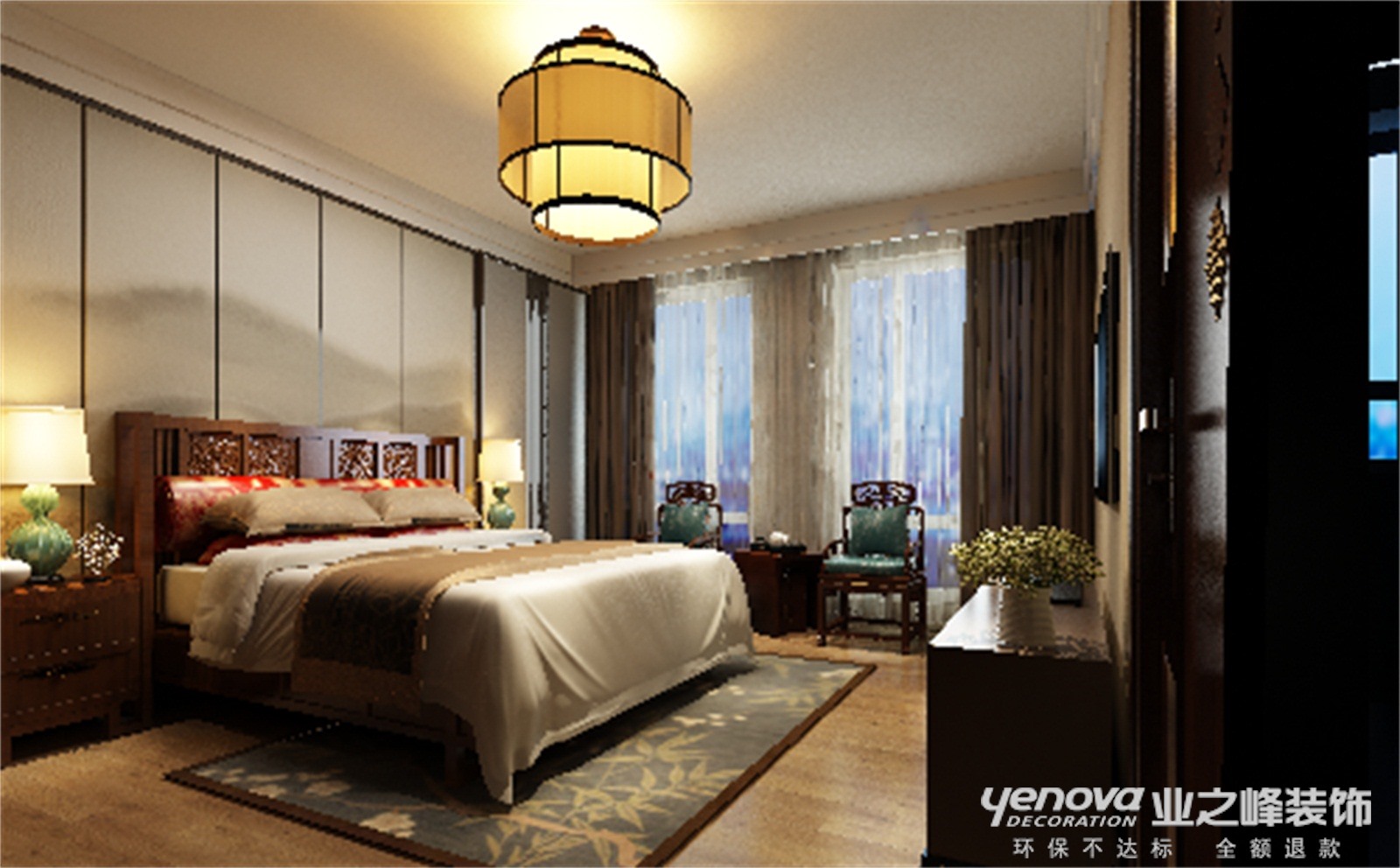 家具结合中式的装饰元素,来呈现墙面顶面空间感。顶面和墙面的结合是的空间更得以延伸。本案体现出有化感、空间感,还不能缺乏自在感与情调感。所使用的材料流露出一股浓浓的中式风情。