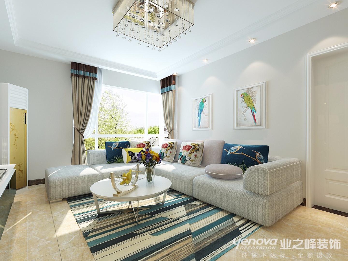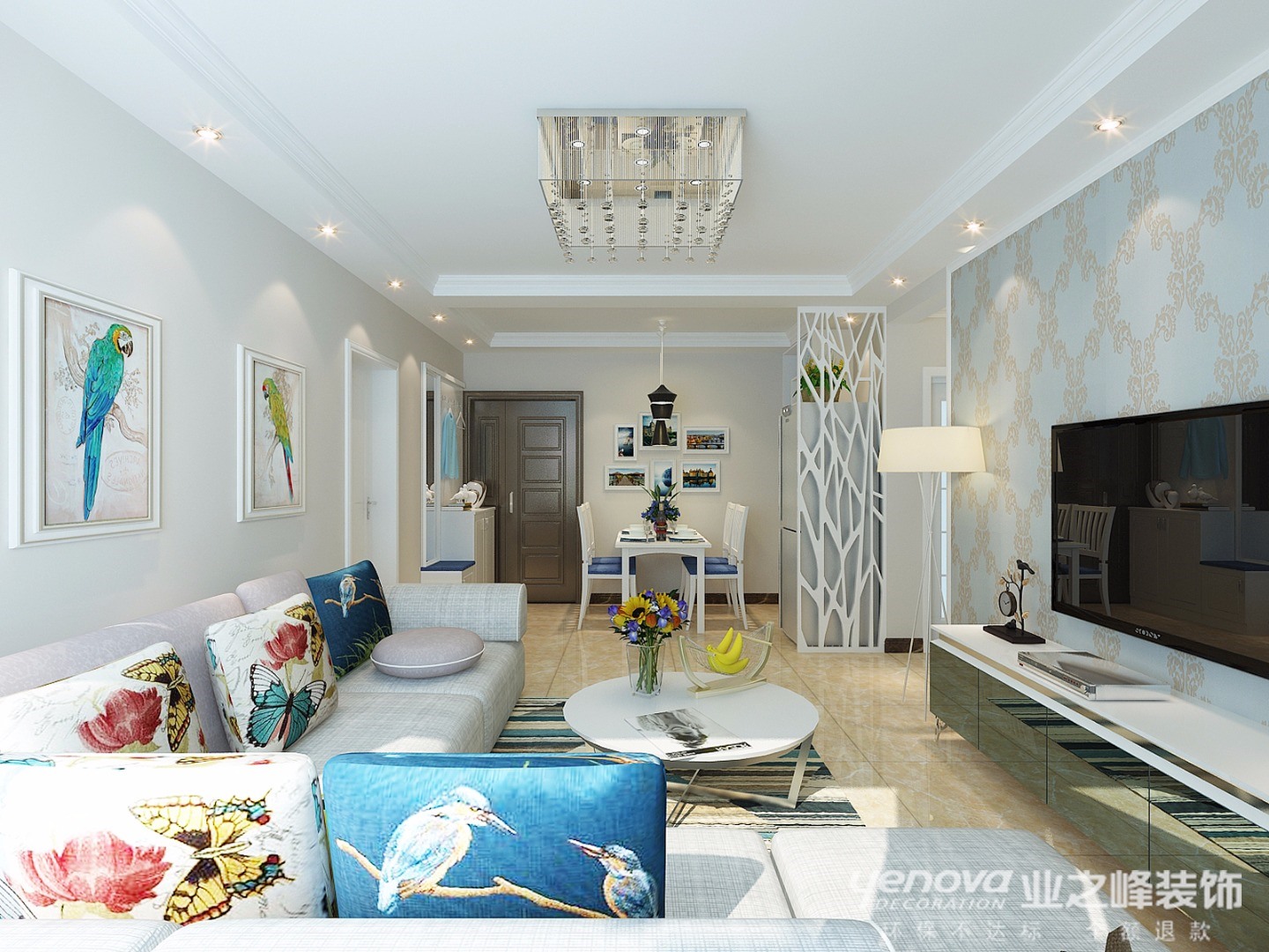 风格定义为现代简约,墙面大部分采用浅咖色墙漆,电视墙采用一面蓝色印花壁纸,简洁大方,灰色亚麻布料沙发搭配艳丽的抱枕,不会显得很沉闷,墙面鸟儿的挂画呼应了抱枕的蝴蝶花香,让人心情愉悦,对生活充满了美好的向往。