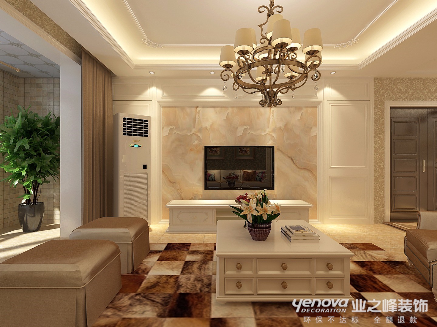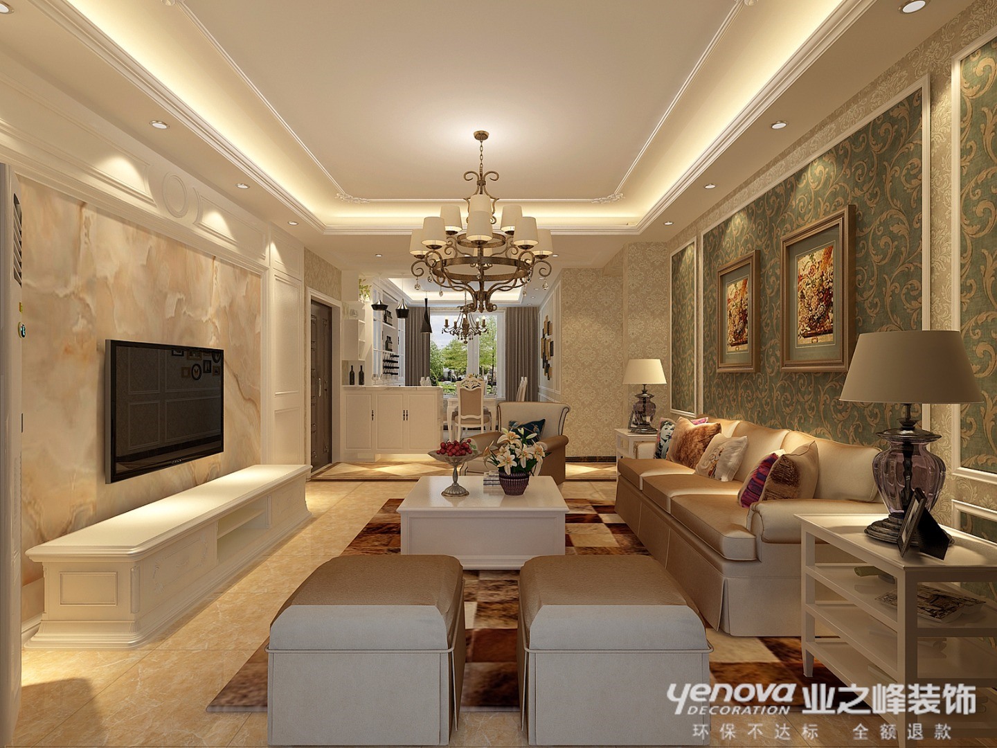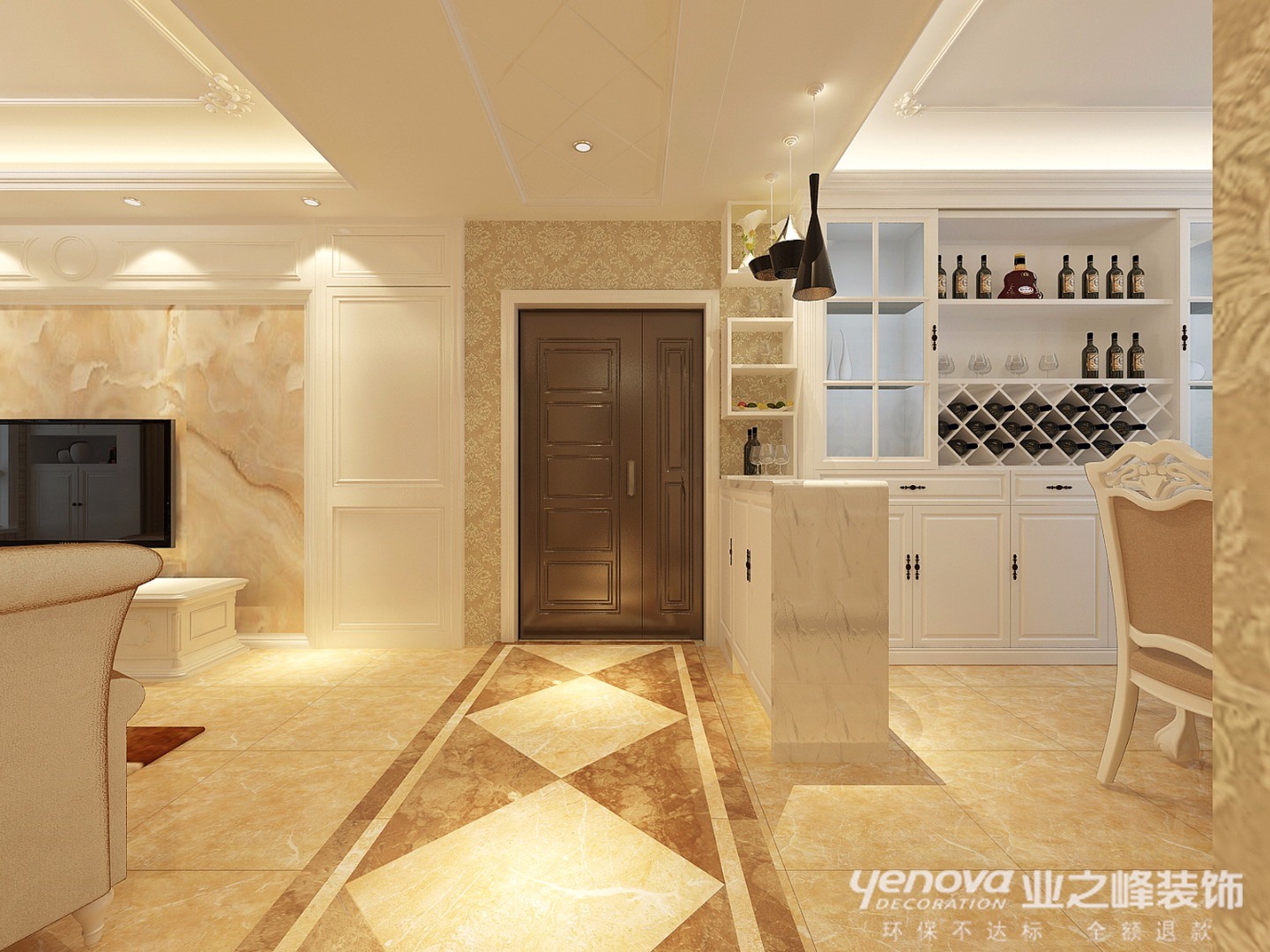 风格定义为简欧,墙面大部分采用大马士革花纹壁纸,电视墙白色墙板与石材完美结合,搭配沙发背景清新的绿色卷叶草壁纸,彰显低调的奢华。餐厅一组酒柜和一个吧台让生活多些情趣,过道上的拼花延伸的玄关背景墙,玄关墙上的马赛克发财树象征着财源广进生活富贵。