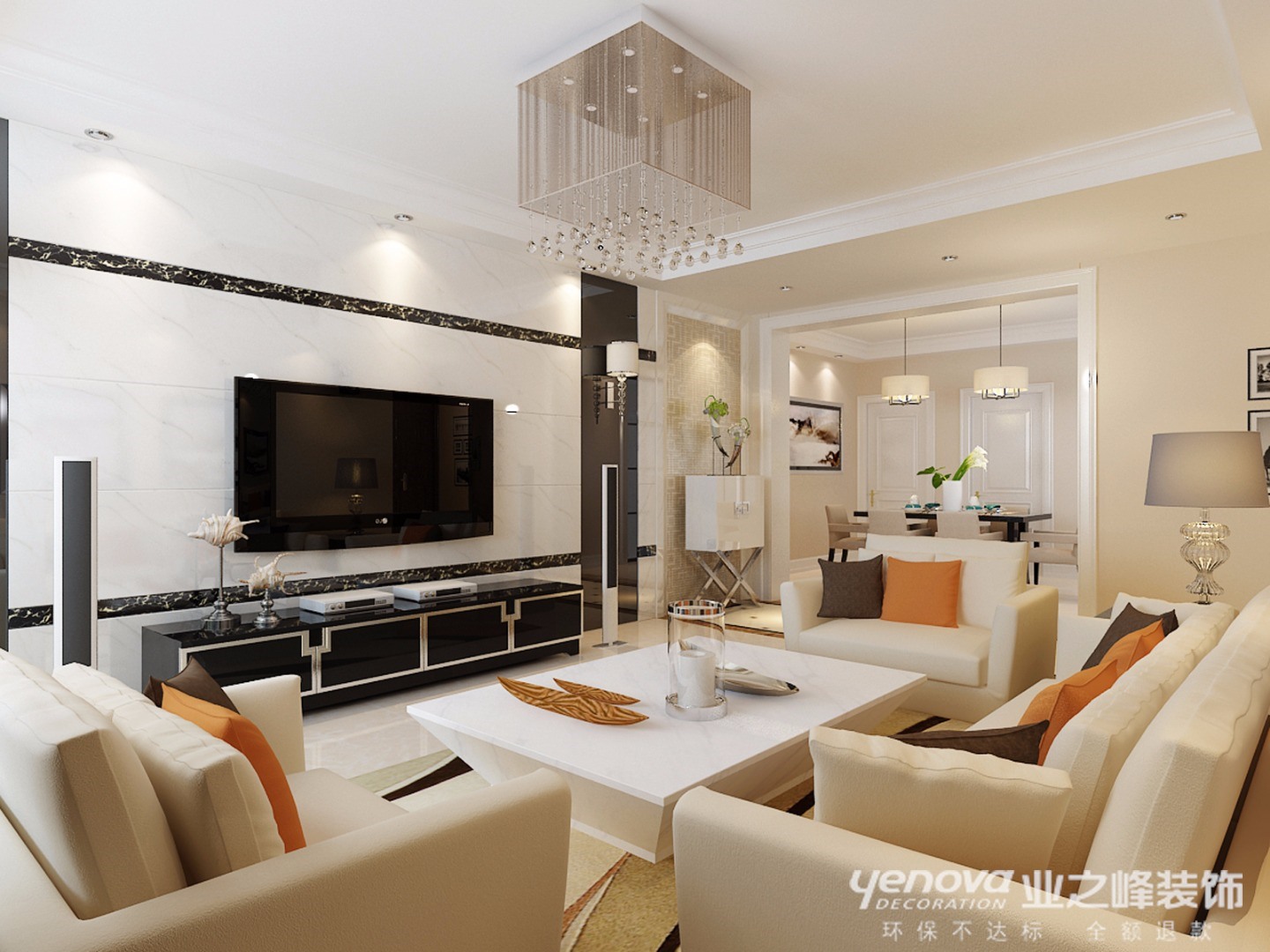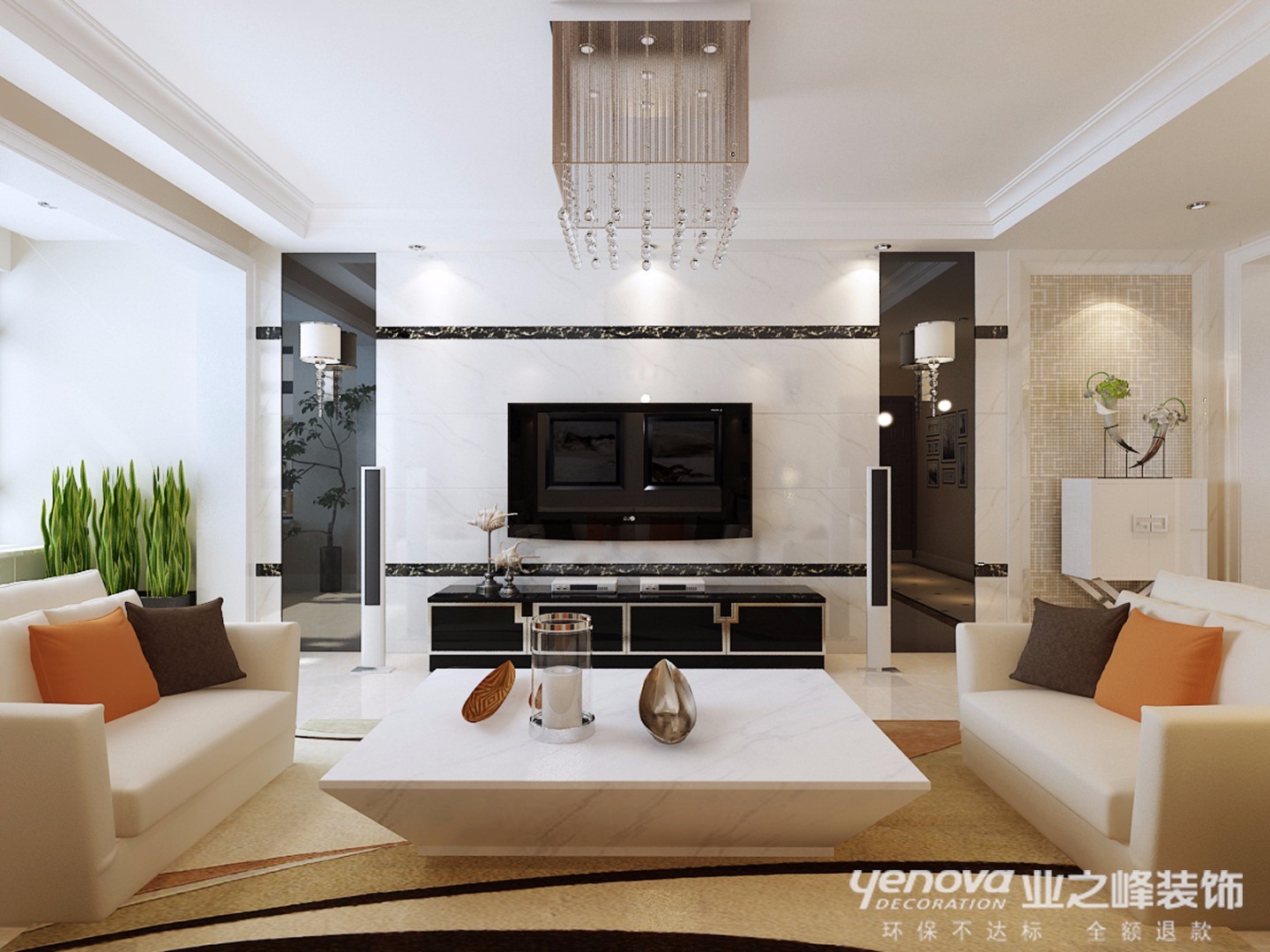 本案对户型结构根据业主的生活方式稍作了调整,充分利用了空间,增加了储藏实用功能,把厨房的门改到了餐厅的位置,更方便与生活,电视墙采用了石材与镜面搭配效果大气,很有品位,造型别致新颖,空间整体色调稳重大气而又不失优雅,符合年轻人对时尚和魅力的要求。