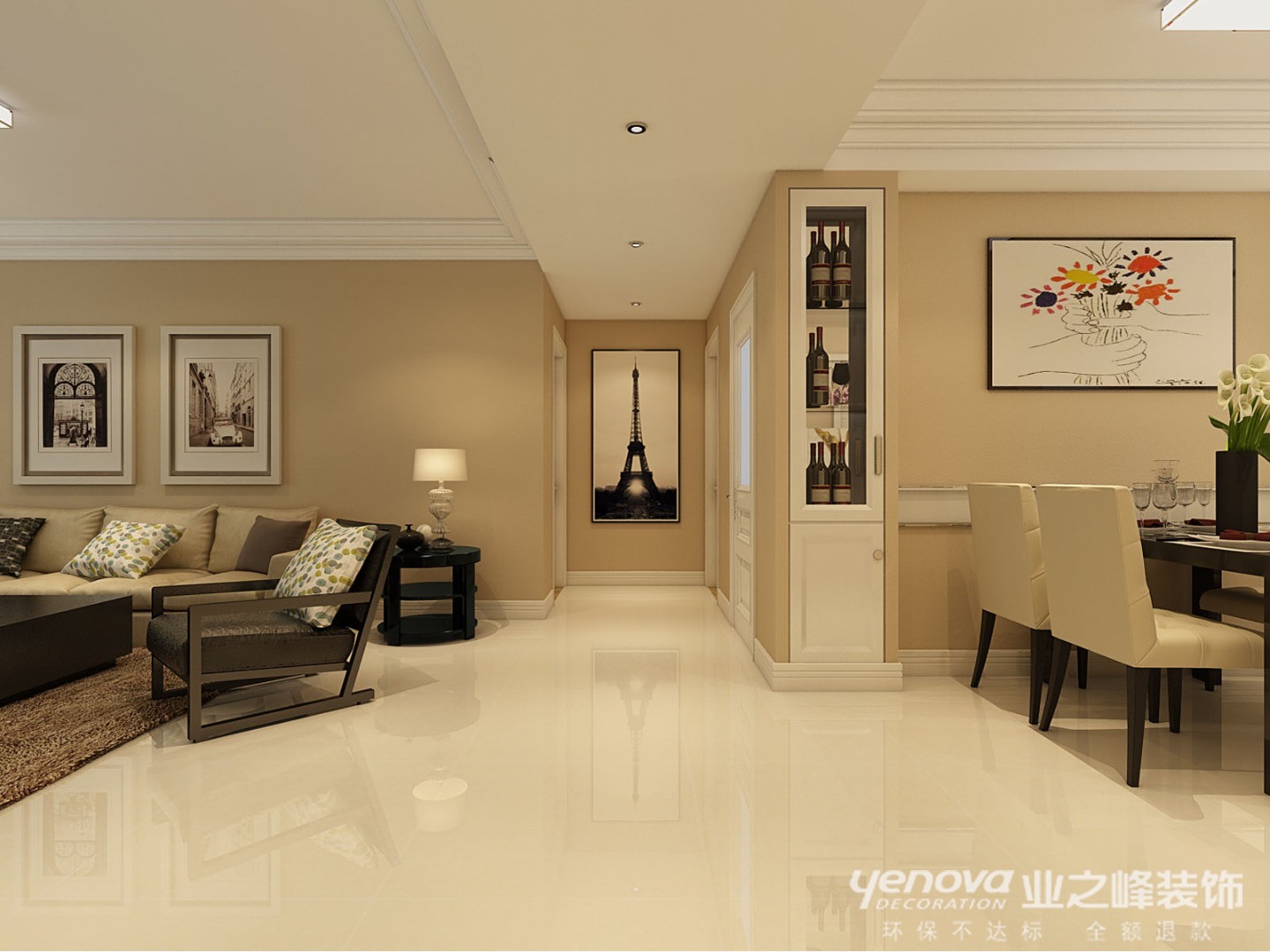 此方案的风格倾向定位为现代风格。业主崇尚清新时尚的现代雅致风格.本案的设计重点是会客空间与门厅、餐厅以及过道空间互通与交流,从设计手法上采用了从墙面上的线与面衔接呼应,以及顶面的空间的虚拟划分。壁纸、镜子与家具配饰的使用,使空间更加丰富与温馨。达到各功能空间融会贯通的目的。