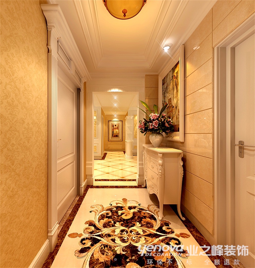此设计方案风格倾向定位为简欧。本案的设计重点是会客空间与门厅、餐厅以及过道空间互通与交流,从设计手法上采用了从墙面上的线与面的衔接呼应,以及顶面的空间的虚拟划分,达到各功能空间融会贯通的目的。
