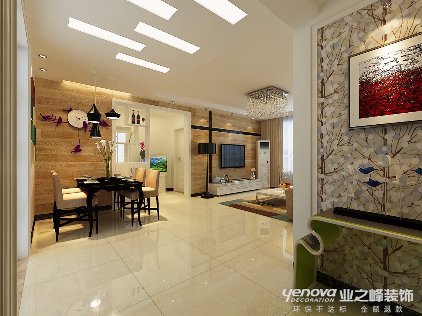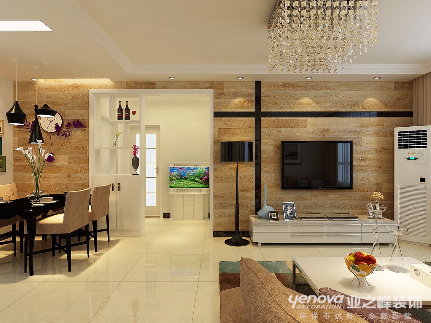 本案定义为现代风格,电视墙采用浅色木地板饰面搭配黑色镜面,打破整体的沉闷感,餐厅顶面造型别致,简单大气,不失优雅。
