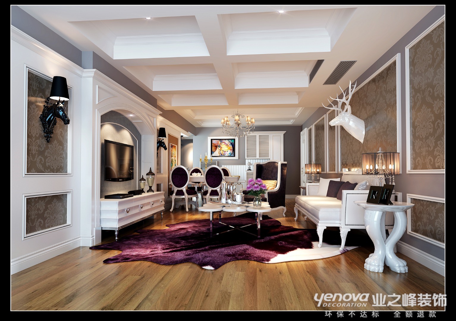 背景墙的造型、马头的壁灯、沙发背景的鹿头装饰,尽显原始自然的美.