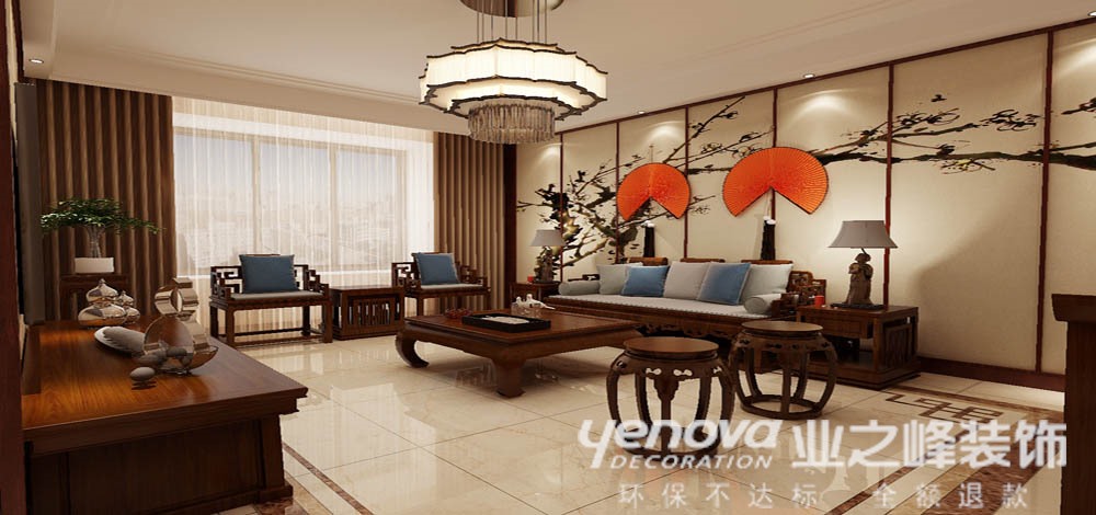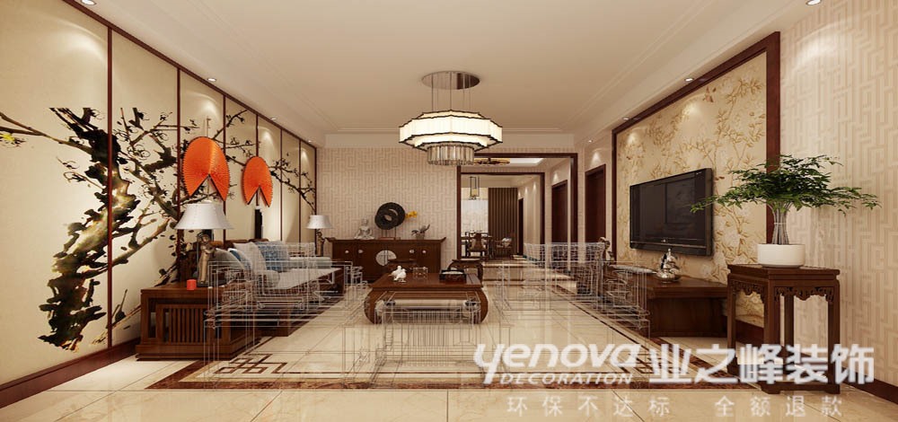 中式装饰画,灯具搭配简朴而优美,传统中透着现代,现代中揉着古典。顶面则以石膏板造型,简洁而硬朗。地面铺贴仿石材瓷砖简约大气。