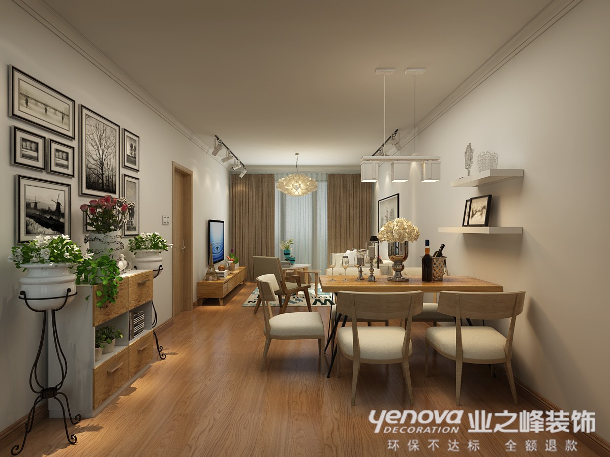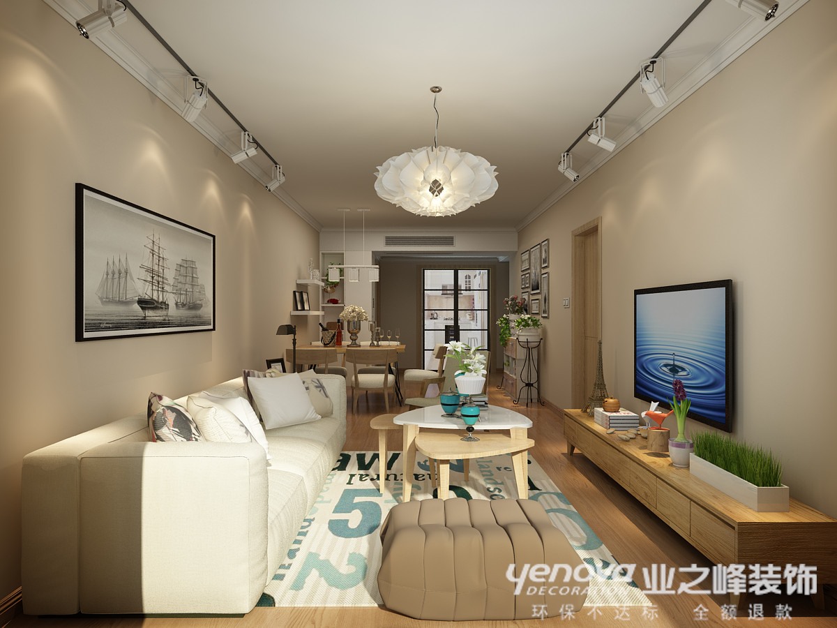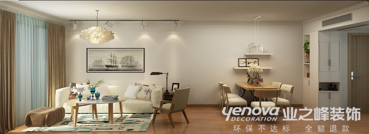 设计说明: 现代简约风格主要表现在空间开敞、内外通透,在空间平面设计中追求不受承重墙的限制自由。所以在设计现代简约的时候,很多时候都会考虑到墙面、地面、顶棚等的协调性。