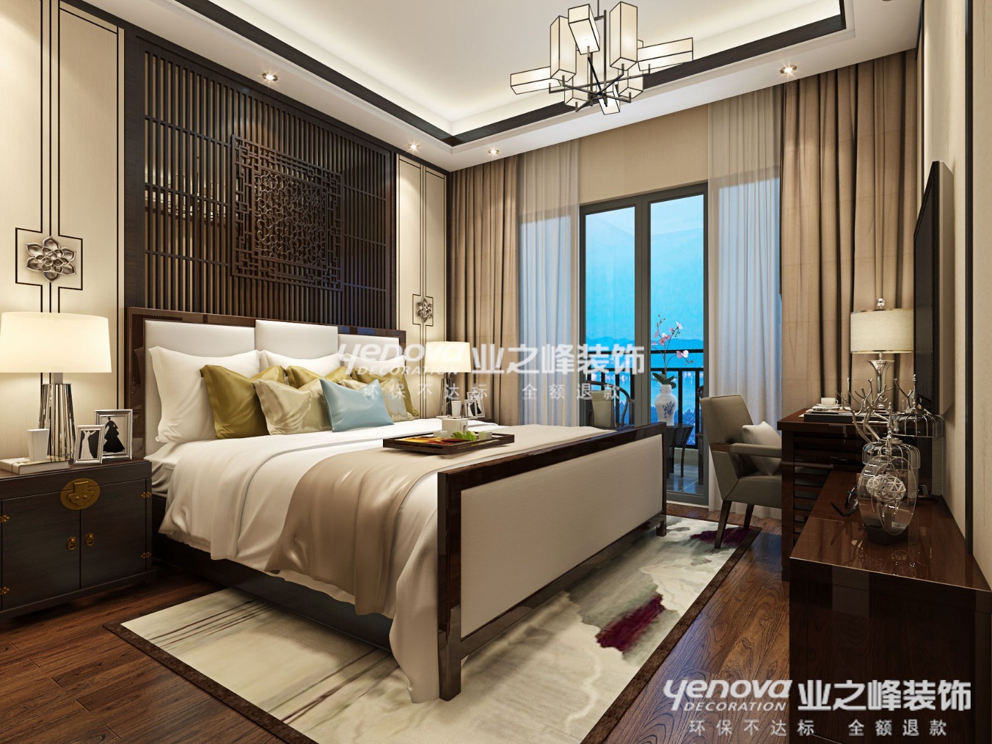 空间装饰多采用简洁硬朗的直线条。直线装饰在空间中的使用,不仅反映出现代人追求简单生活的居住要求,更迎合了中式家具追求内敛、质朴的设计风格,使“新中式”更加实用、更富现代感。整体家具多以深色与白色布艺相结合为主,与白色墙面相得益彰。