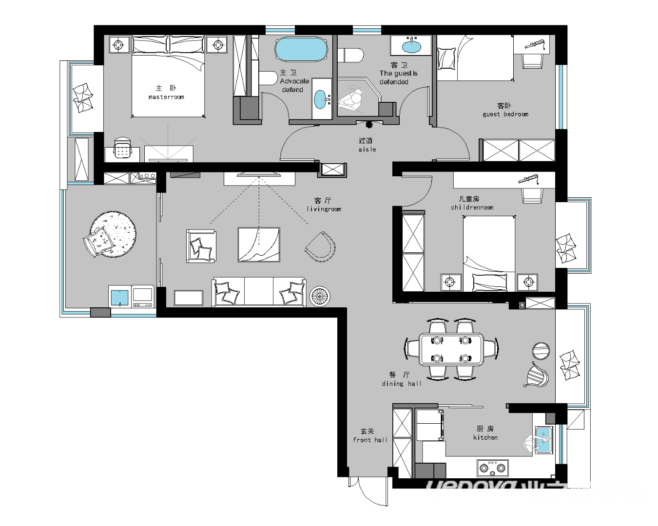 烤漆烤技术时尚造型的长餐桌,带出奢华、优雅的视觉享受;在主卧背景墙的硬包、镜面,透露屋主本身丰厚的人文质感品味。在空间的调性里格局把“动、静”分离的状态。藉由专业的平面整合、动线规划、设计出气质优雅的户型图