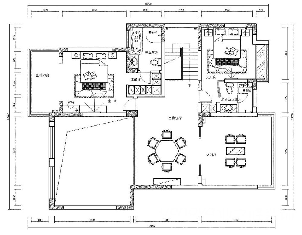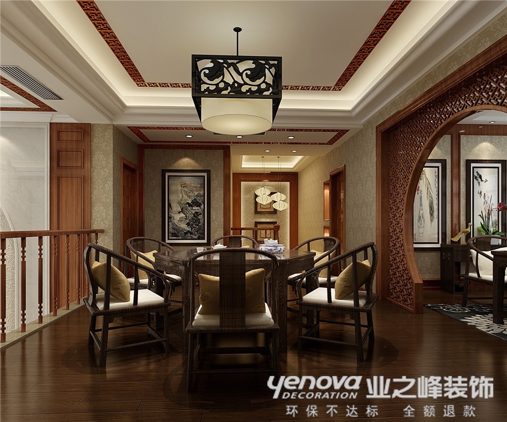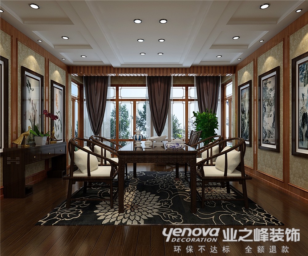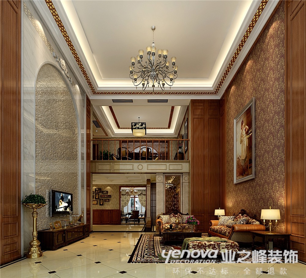 本案女主人喜欢欧式的典雅,男主人喜欢中式的内涵,同时又希望空间能尽可能开敞。最终决定采用美式与中式相结合的设计风格,利用深色实木墙板和实木雕刻图案的衔接,让一层挑高客厅的美式与二层中式风格融合在一起。